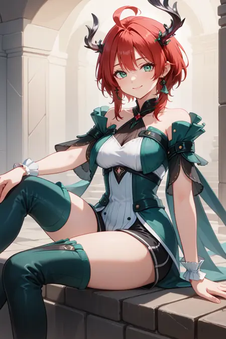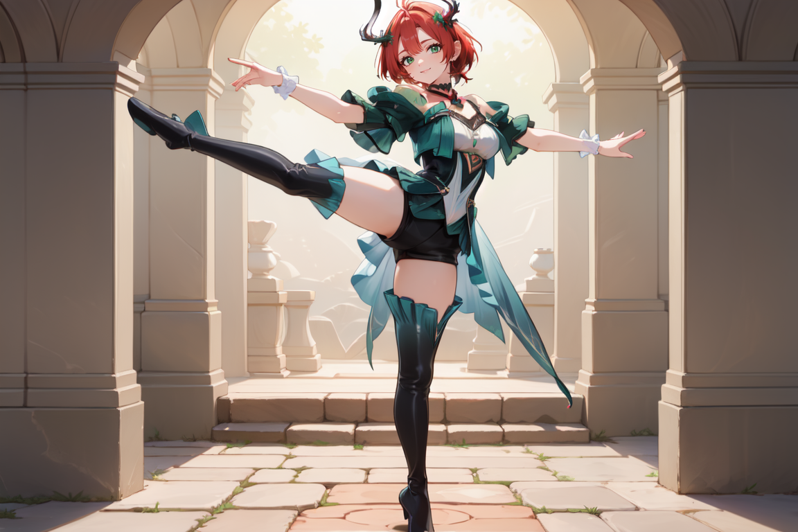 補助ワード:緑の目、緑のドレス、黒いショートパンツ、太ももブーツ