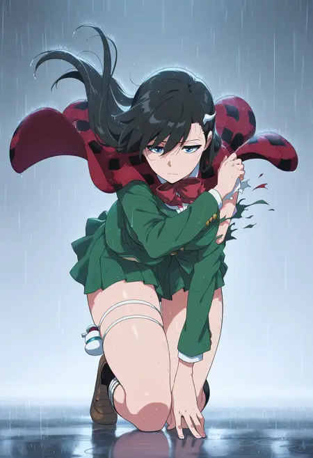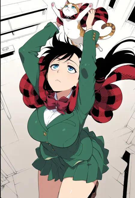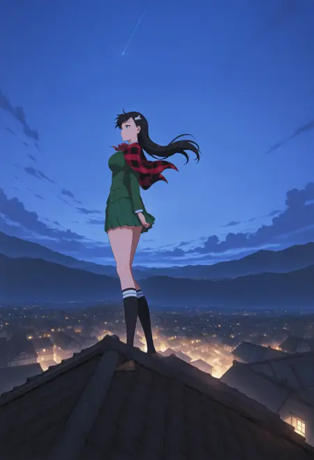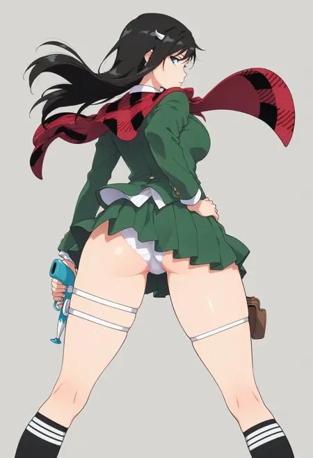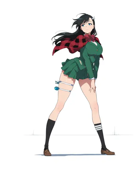 school uniform, green jacket, green skirt, pleated skirt, red scarf, checkered scarf, black socks, thigh strap