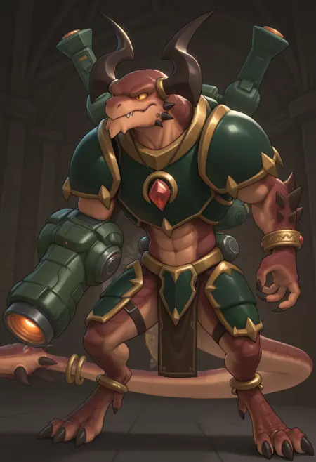 主服装:项链,绿色胸甲,绿色肩甲,单只金色手镯,绿色腿甲,骨盆帘,单只金色脚环,金色尾环,武器,臂炮,绿色喷气背包,