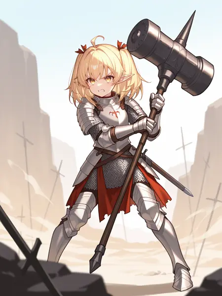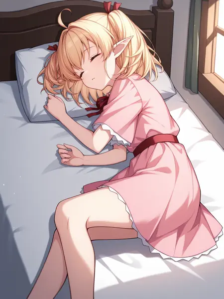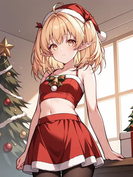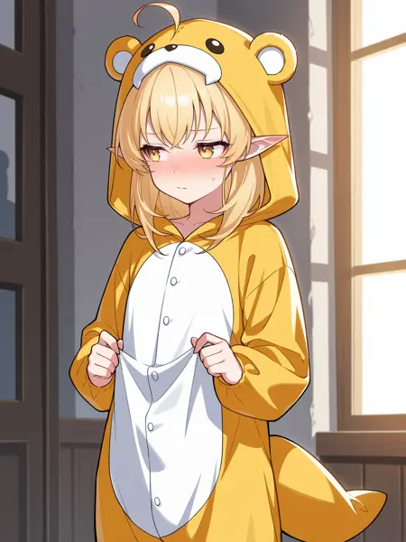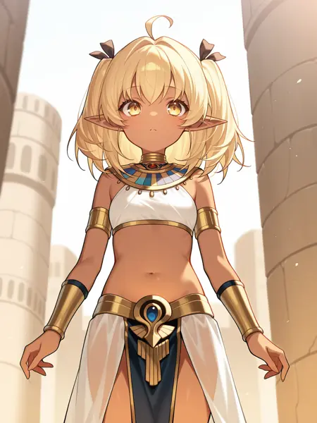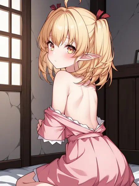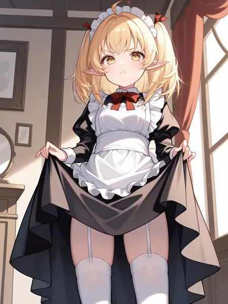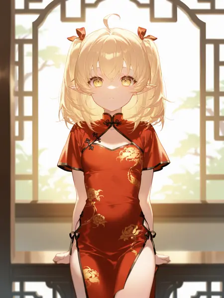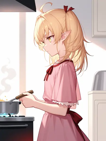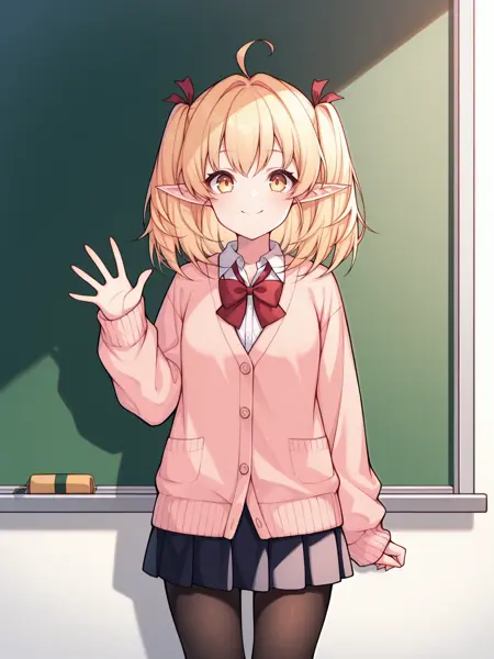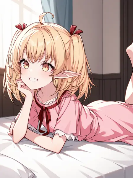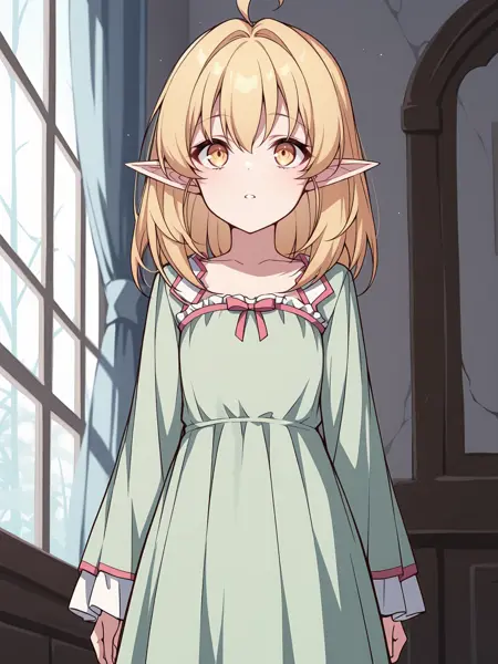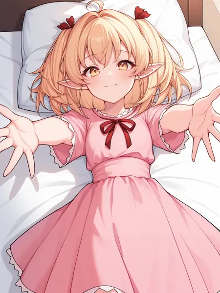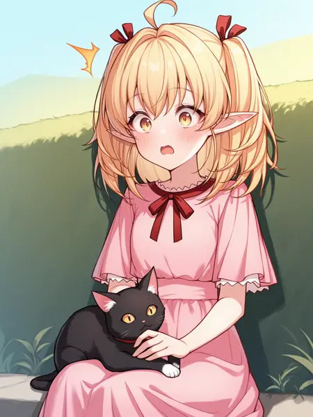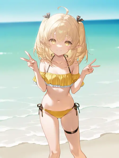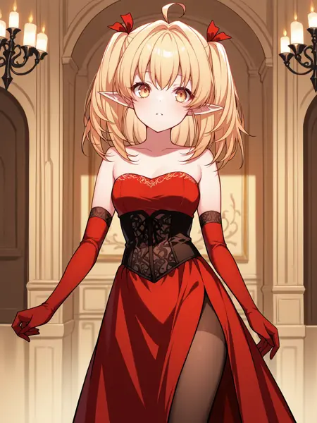 Apperance: lilyhl, blonde hair, yellow eyes, two side up, hair ribbons, pointy ears, ahoge