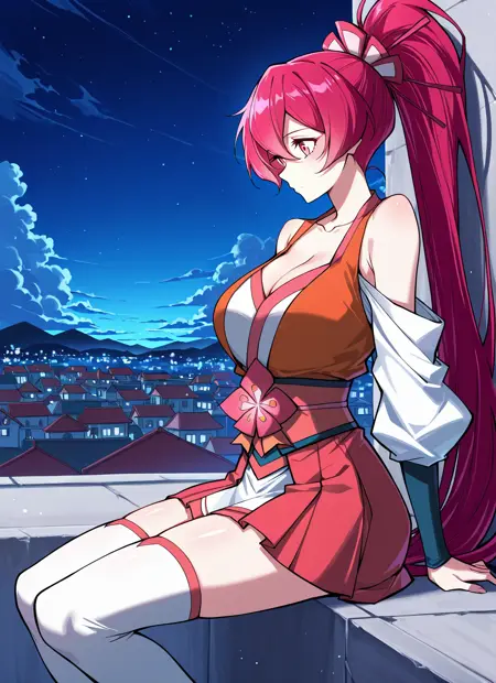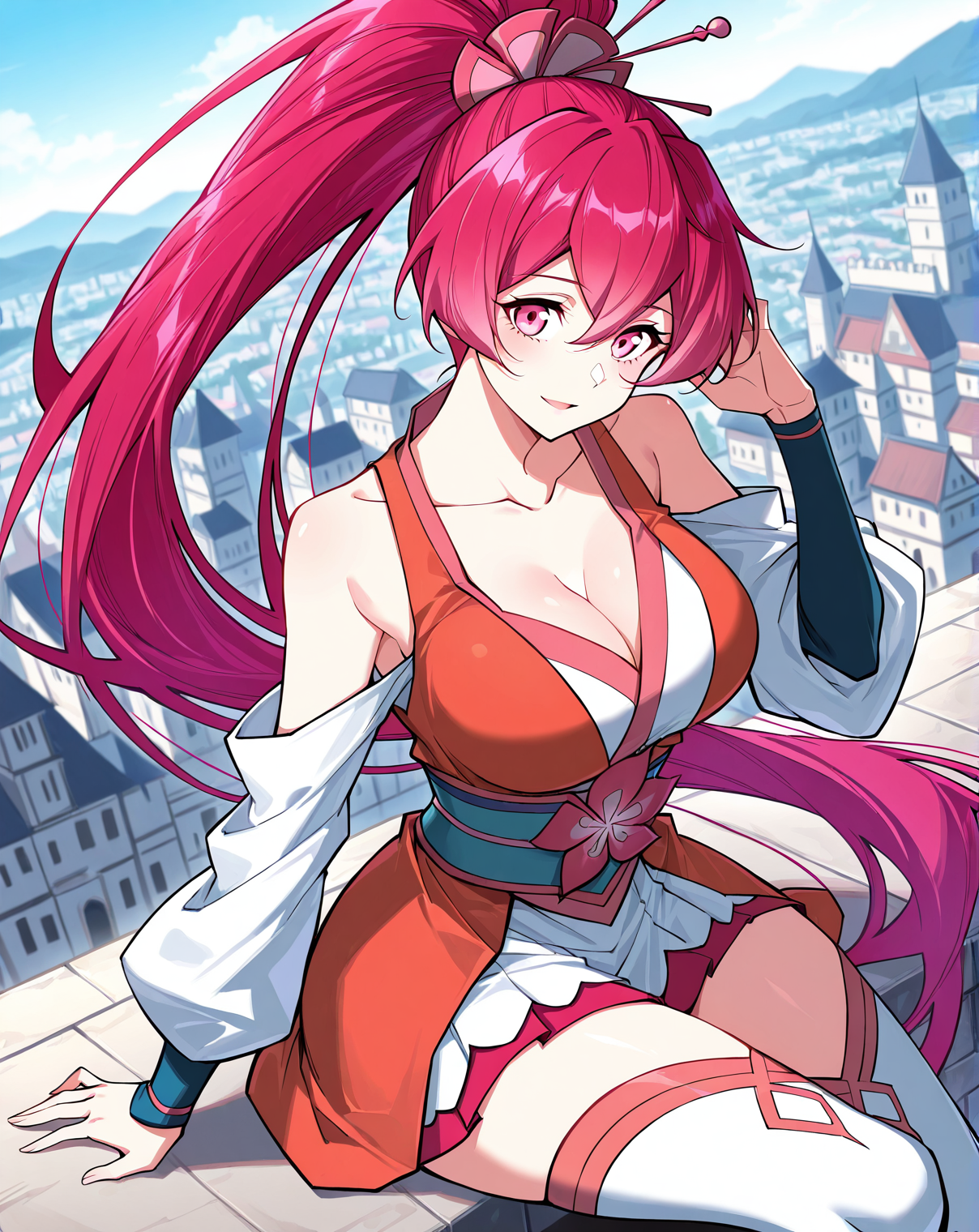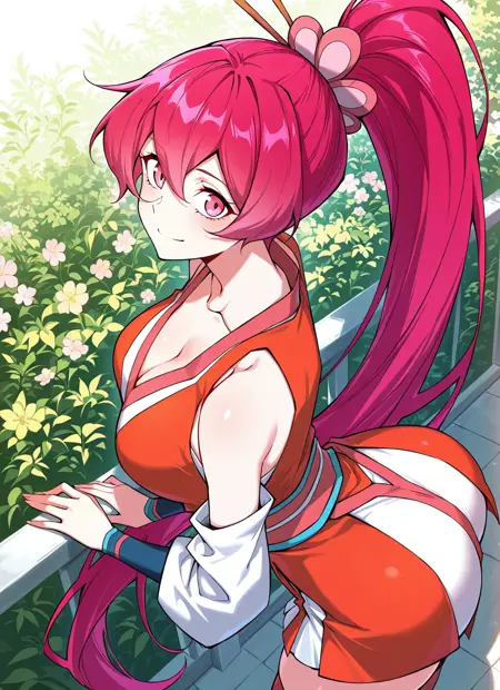 1 girl, solo, pink eyes, pink hair, red hair, very long hair, bangs, hair between eyes, ponytail, high ponytail