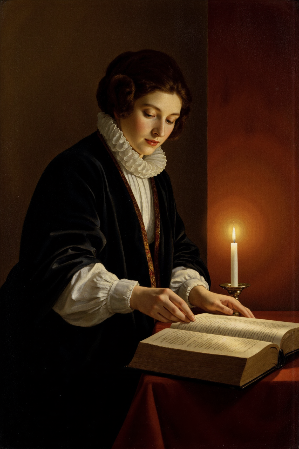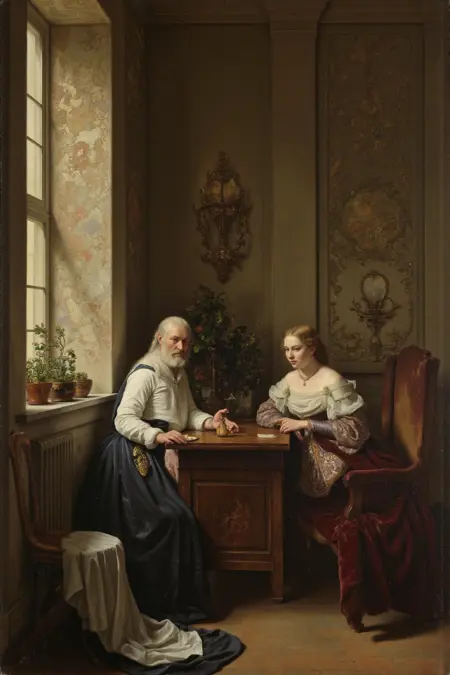“烛光映照下的忧郁室内场景,仿若荷兰黄金时代绘画。”