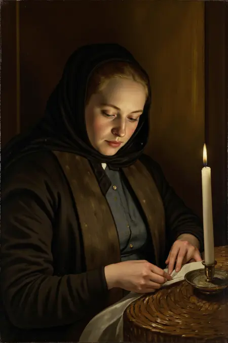 • “烛光映照下的忧郁室内场景,仿若荷兰黄金时代绘画。”