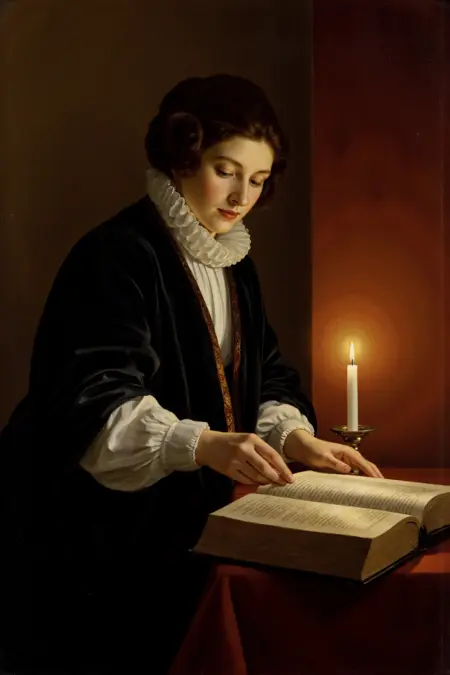 • “一位身着17世纪服饰的女性,柔和光线下的肖像,YFG-P@int 风格。”