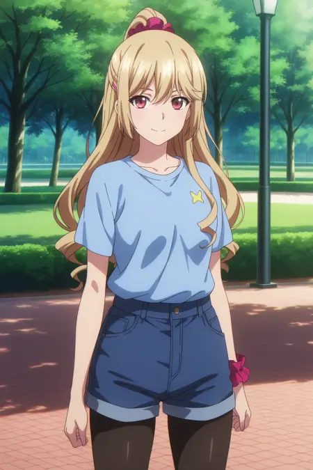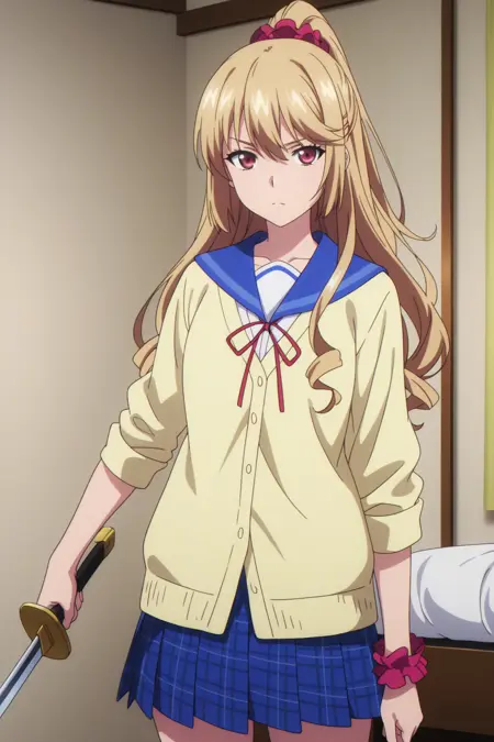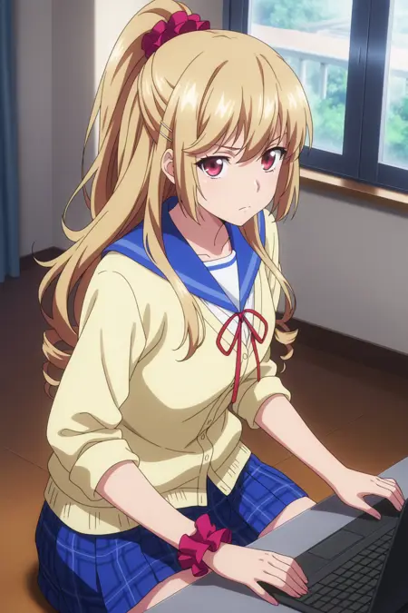 aaasagi, red eyes, blonde hair, hairclip, high ponytail, red scrunchie, school uniform, blue sailor collar, red ribbon, neck ribbon, yellow cardigan, sleeves pushed up, blue skirt, pleated skirt, plaid skirt, wrist scrunchie, anime coloring,