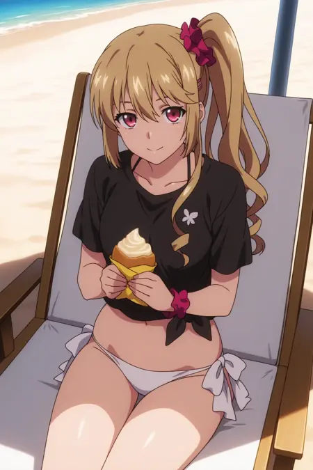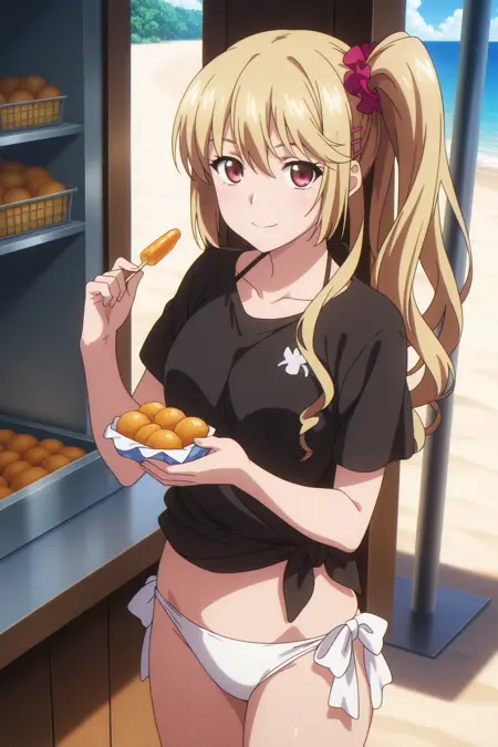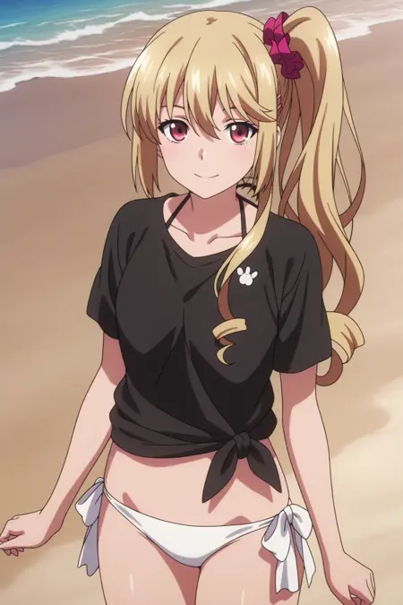 aaasagi, red eyes, blonde hair, hairclip, side ponytail, red scrunchie, black shirt, tied shirt, short sleeves, white bikini, bikini bottom only, side-tie bikini bottom, anime coloring,