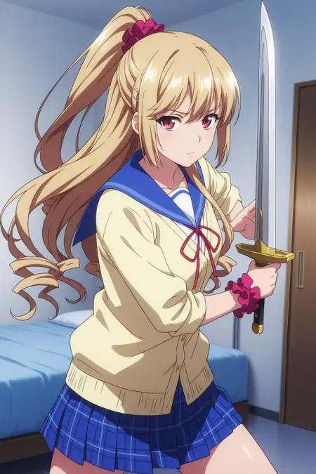 aaasagi, 红眼睛, 金色头发, 发夹, 高马尾, 红色发圈, 校服, 蓝色水手领, 红色丝带, 颈部丝带, 黄色针织开衫, 袖子卷起, 蓝色裙子, 百褶裙, 格子裙, 手腕发圈, 动漫着色,