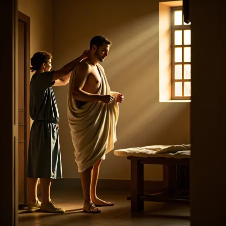 toga exigua — 一种早期、体积较小的纯米白色托加袍,比后期的toga pura更短,常不穿长袍,仅披覆,使一侧肩膀和部分胸部裸露