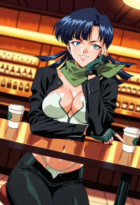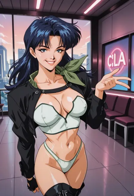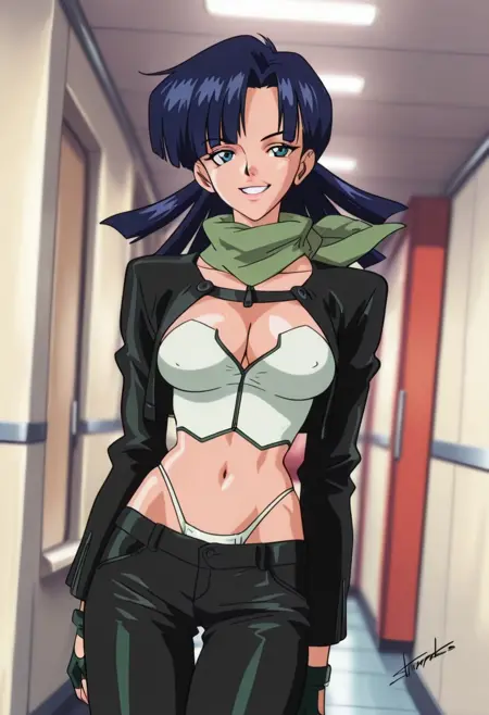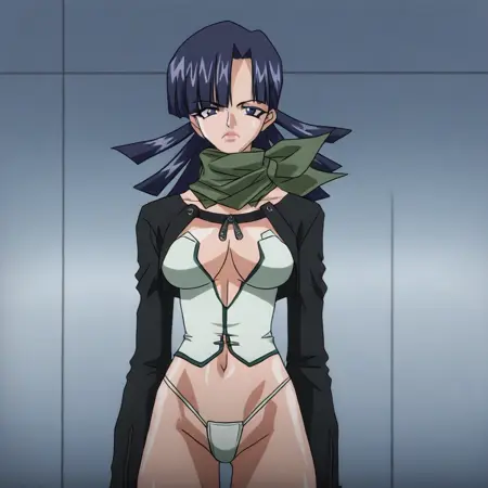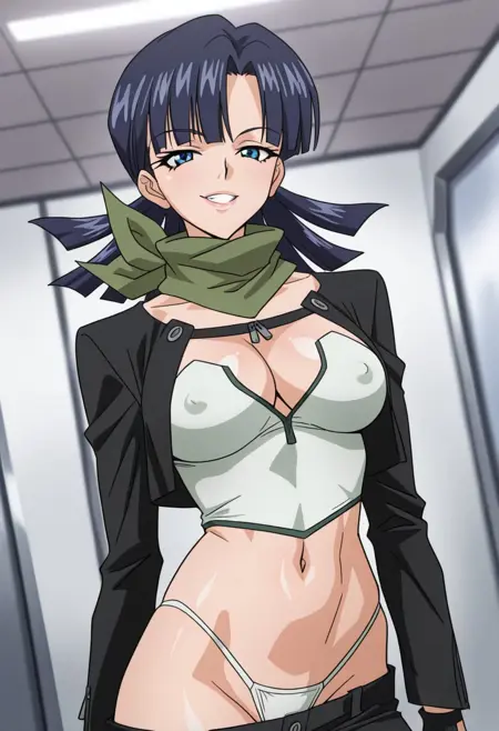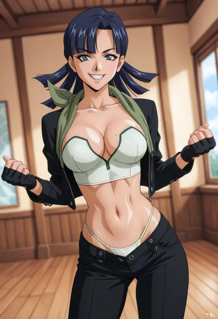 YuParkHtMnD, 1个女孩, 单人, 肌肉女性, 深蓝色头发, 长发, 刘海, 蓝眼睛, 嘴唇, 锁骨, 大乳房, 厚大腿, 乳沟, 肚脐, 腹部, 腹股沟, 黑色短款夹克, 白色无袖短上衣, 白色丁字裤, 黑色长裤, 靴子, 无指手套, 绿色围巾,