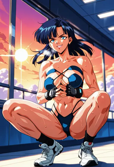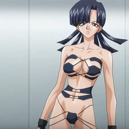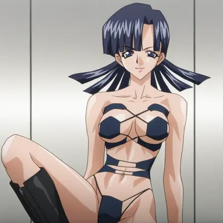 YuParkHtMnD, 1个女孩, 单人, 肌肉女性, 深蓝色头发, 长发, 刘海, 蓝眼睛, 嘴唇, 锁骨, 大乳房, 厚大腿, 乳沟, 肚脐, 腹部, 腹股沟, 泳装, 露骨服装, 靴子, 无指手套,