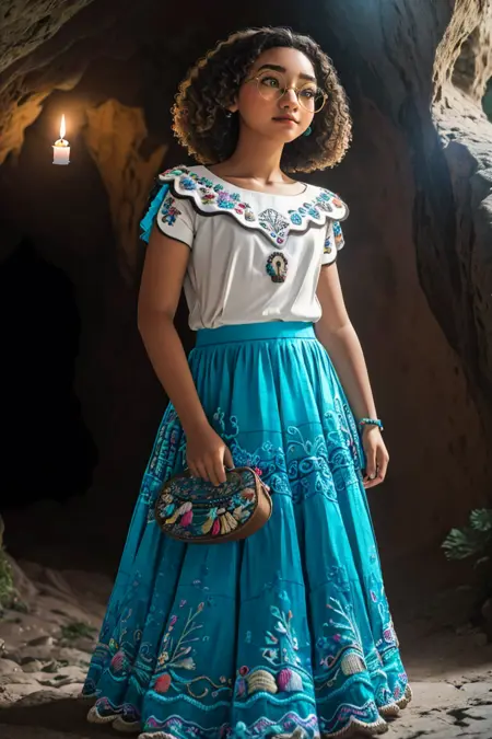 also: (white) blouse, (teal long) skirt, shoes, sometimes you need to add (curly/medium hair). Unfortunately, her bag and shoes were not well trained.