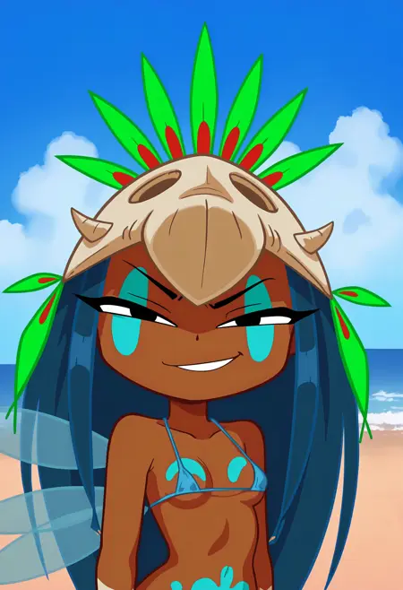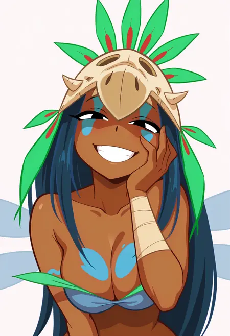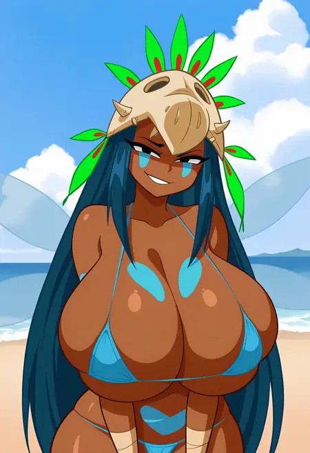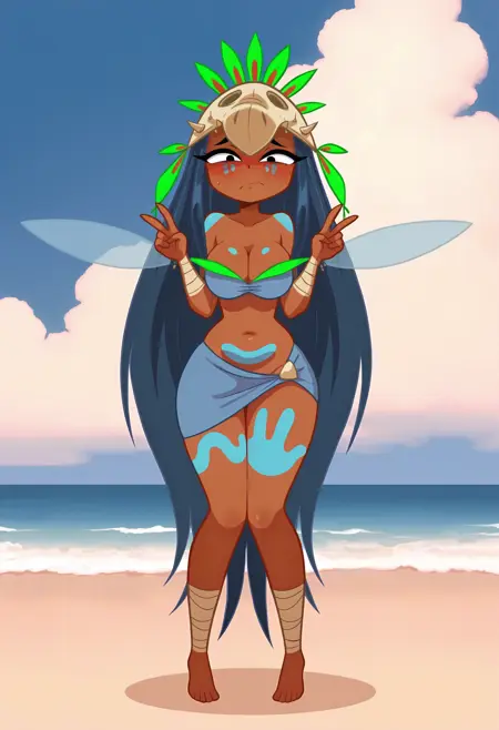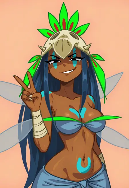 h0lilf, 1girl, 暗い肌の女性, 黒い目, 非常に長い髪, 青い髪, 胸, 胸元, ボディペイント, 腹部, 翼, スカート, 頭飾り