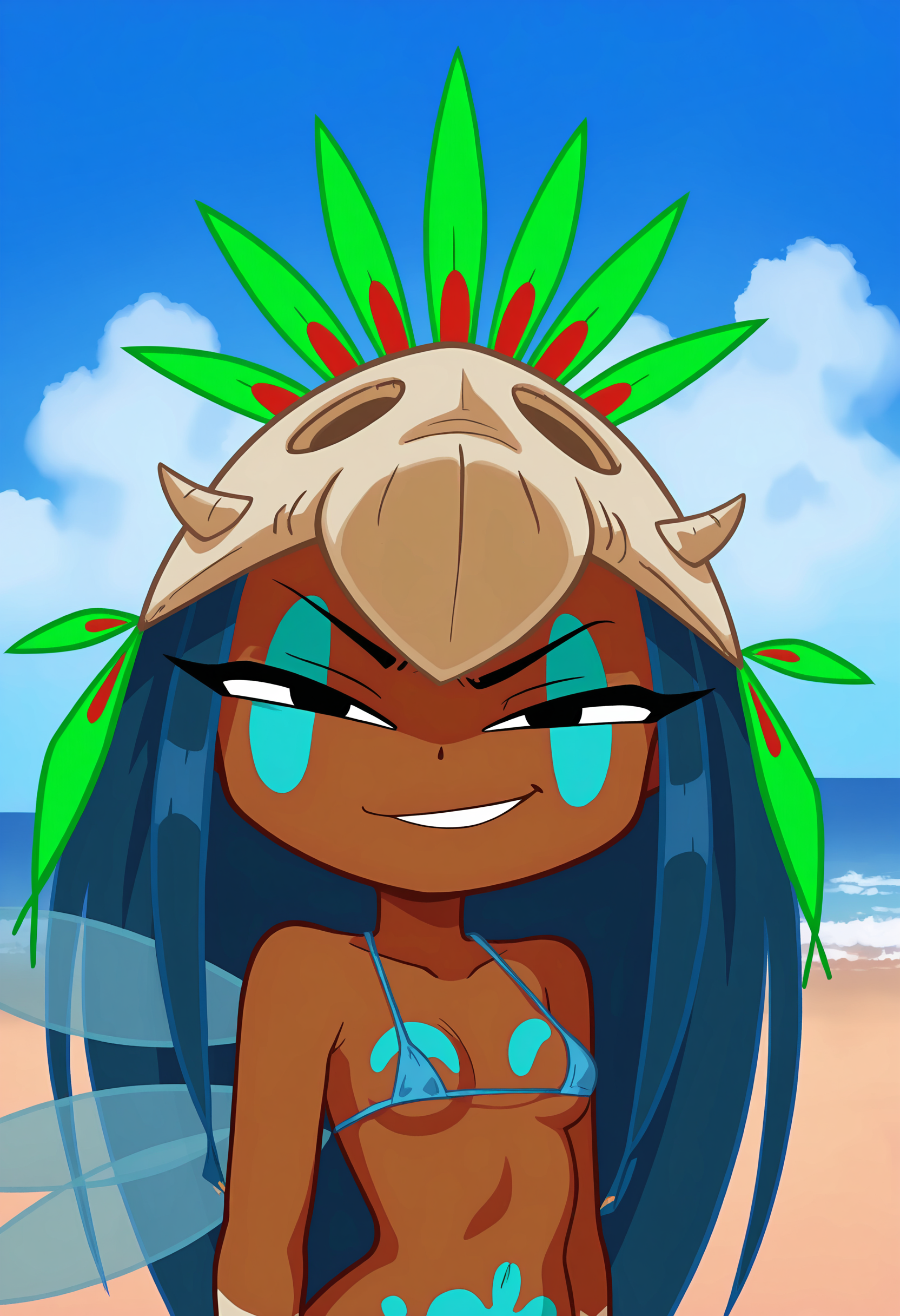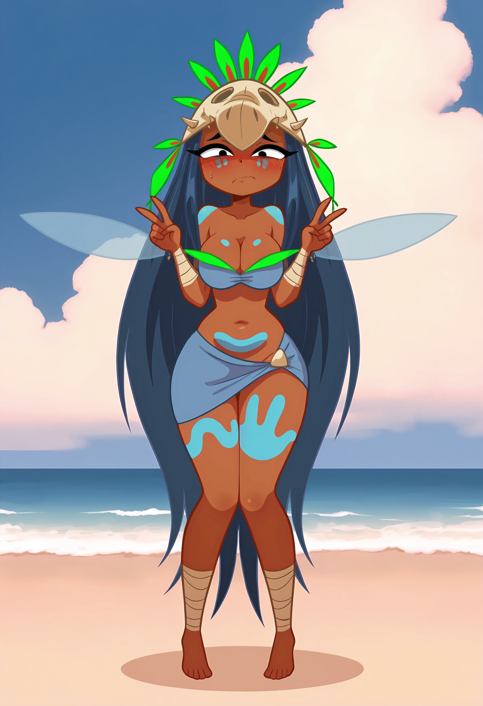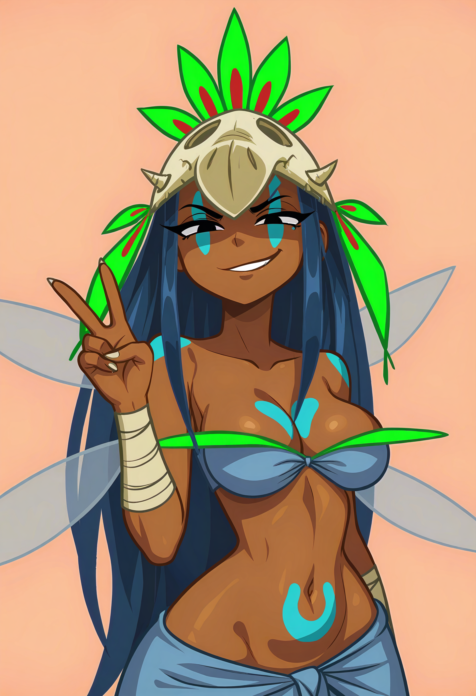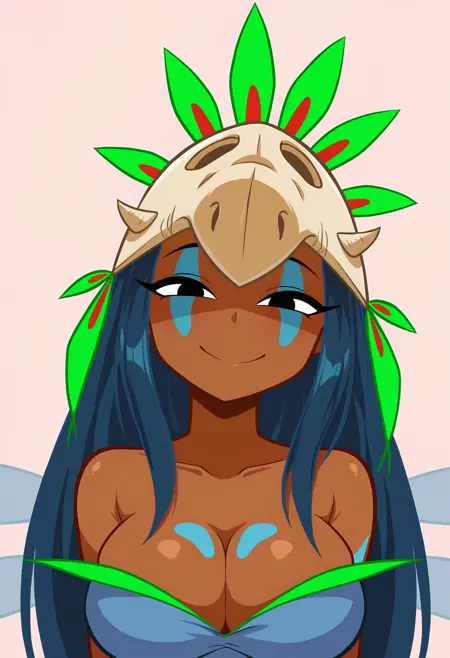 h0lilf, 1girl, 深色皮肤女性, 黑色眼睛, 极长头发, 蓝色头发, 乳房, 乳沟, 身体彩绘, 露腹, 翅膀, 裙子, 头饰,