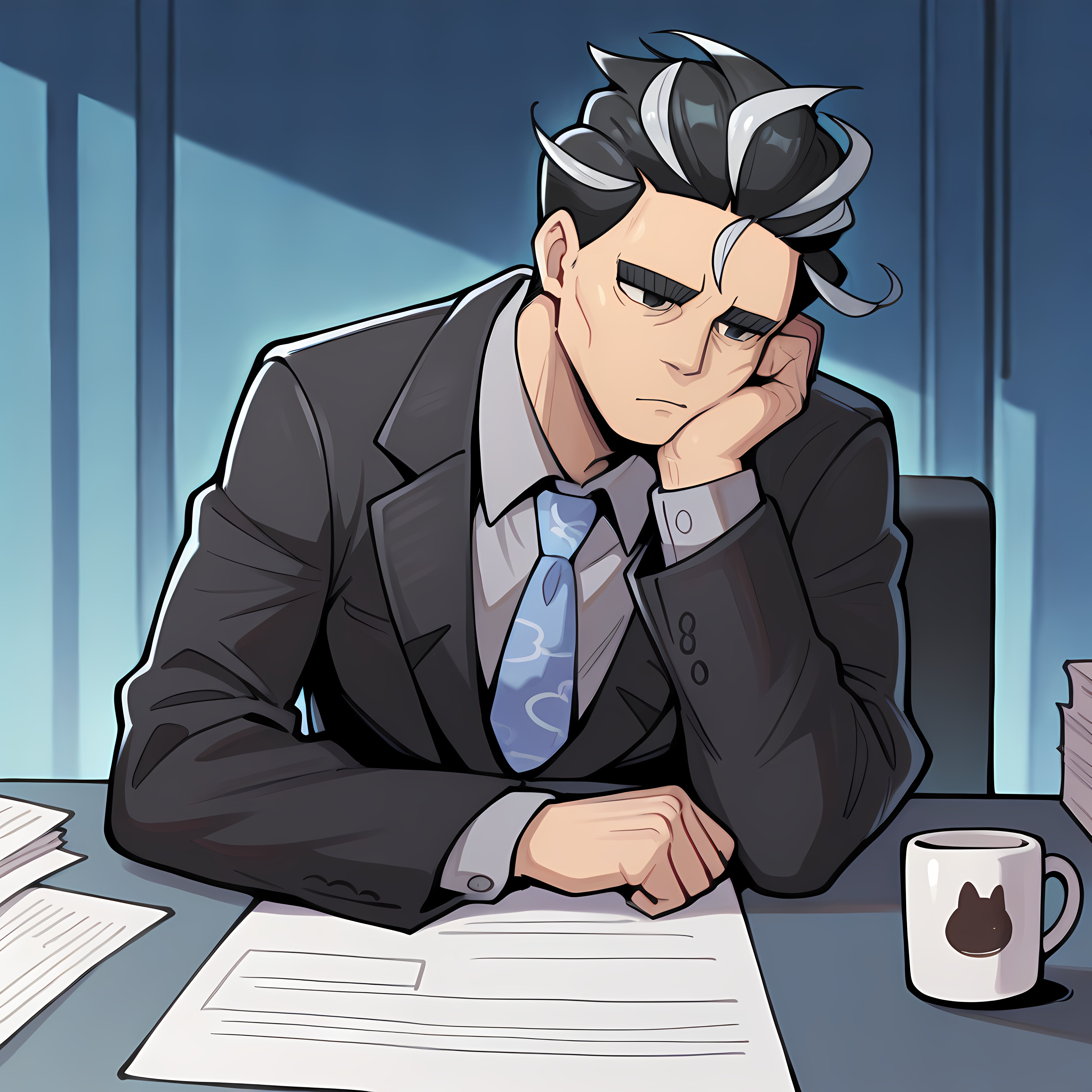 追加:短い髪、複色の髪、黒髪、ストライプの髪、黒い目、太い眉、シャツ、ブラックジャケット、長袖、青いネクタイ、グレーのシャツ、スーツ、黒いズボン、しかめっ面、白いシャツ