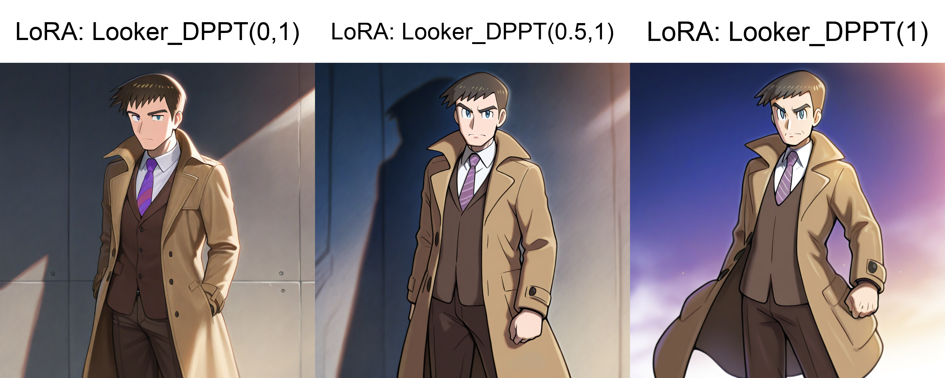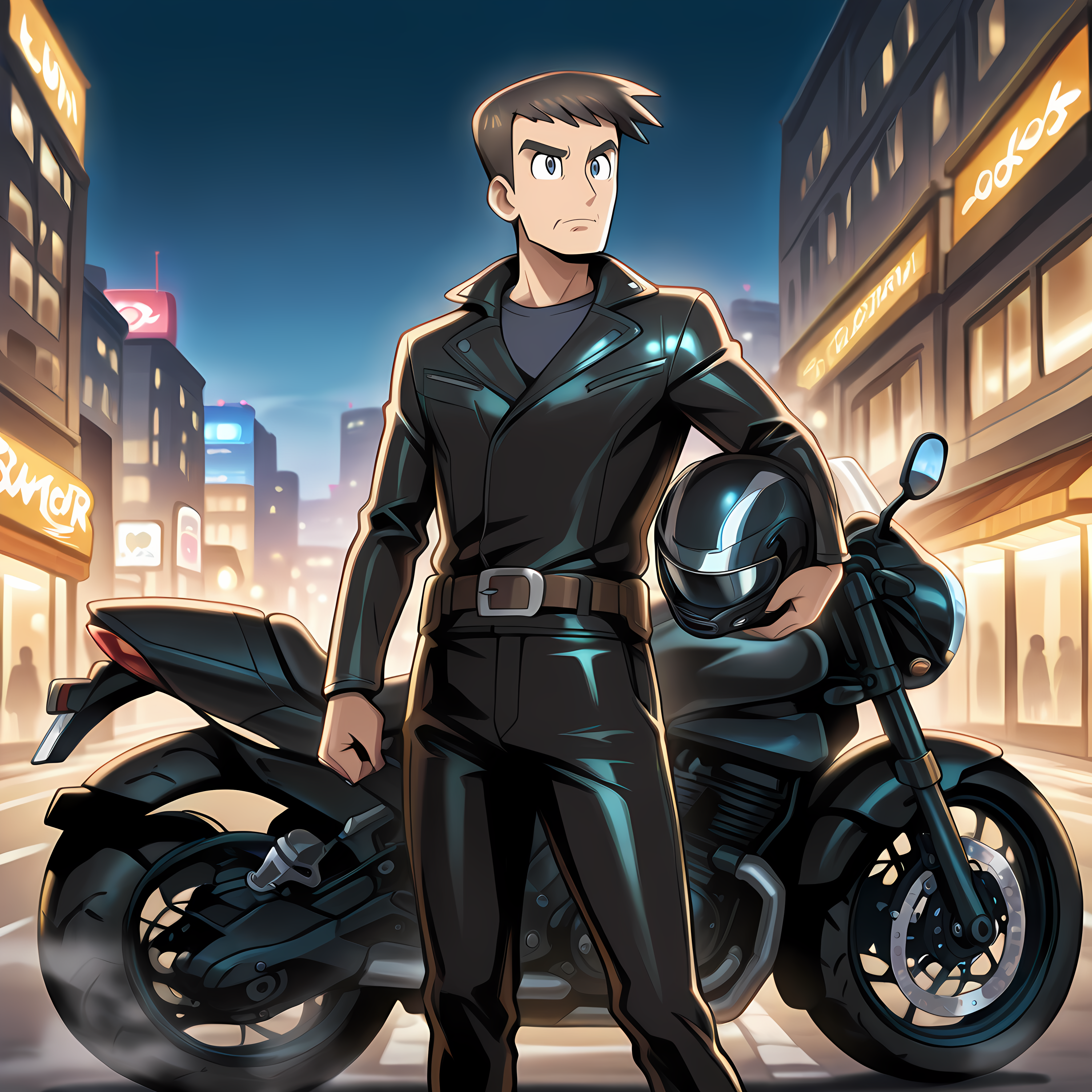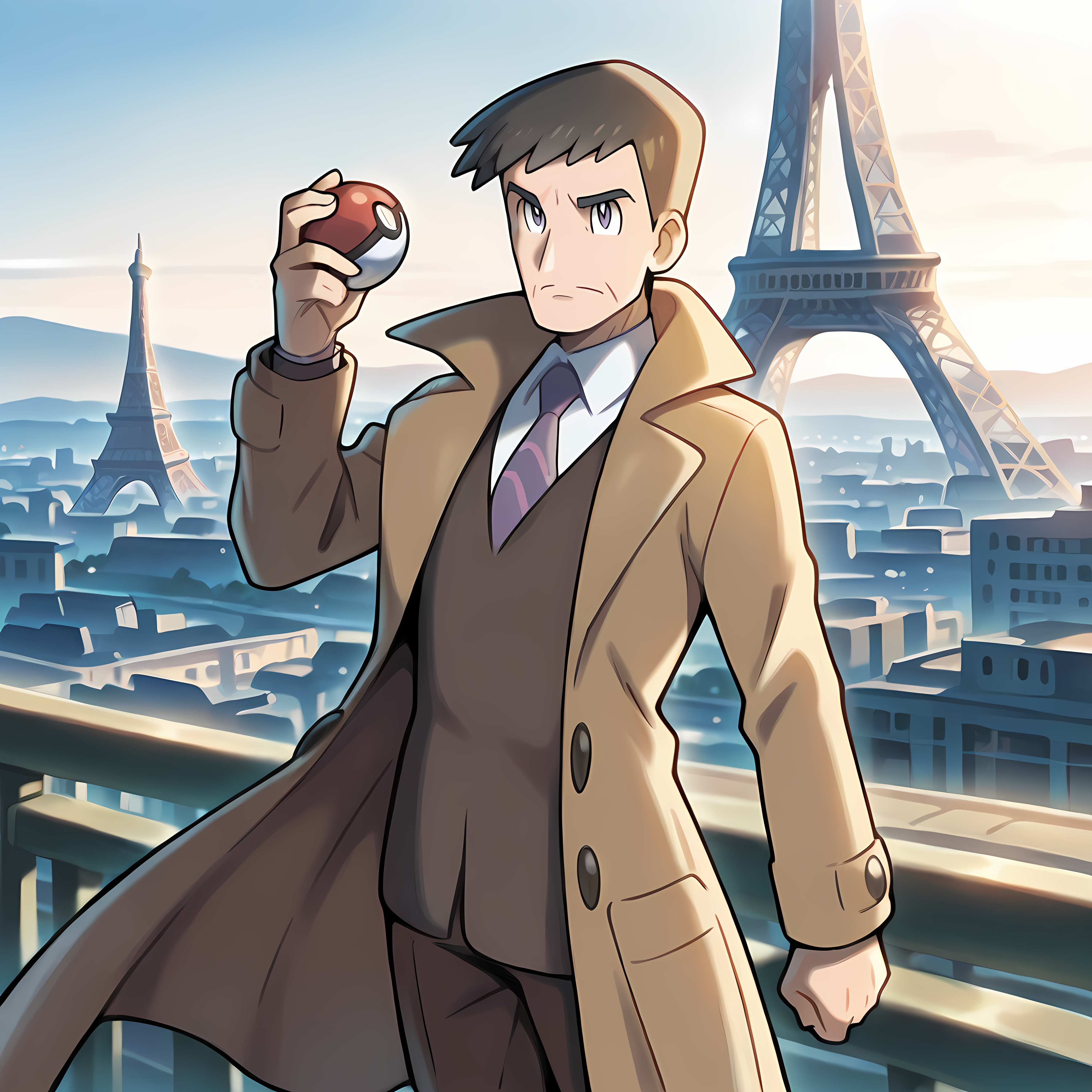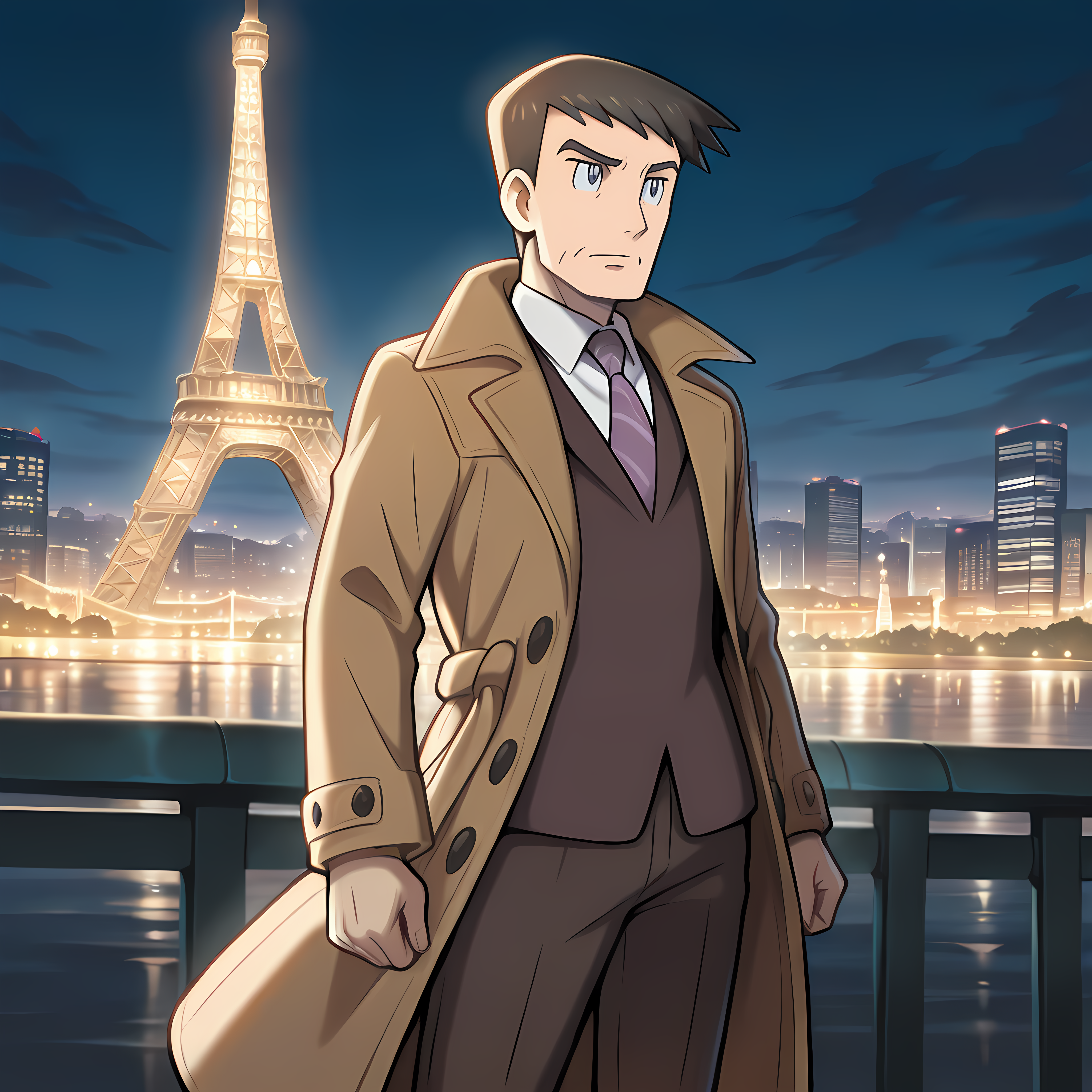 追加:短い髪、シャツ collar、白いシャツ、茶色のコート、長袖、紫のネクタイ、開いたコート、トレンチコート、茶色のパンツ
