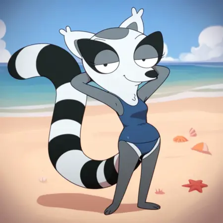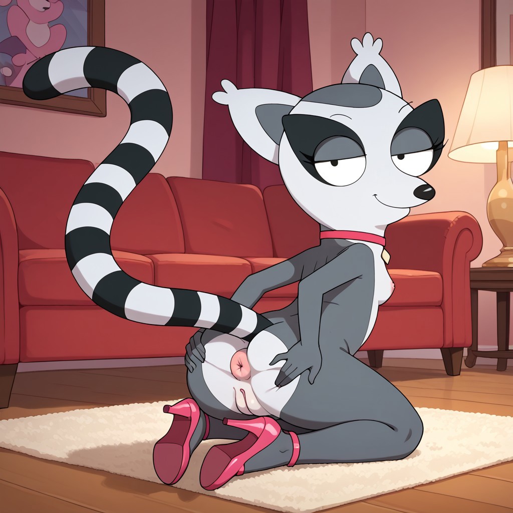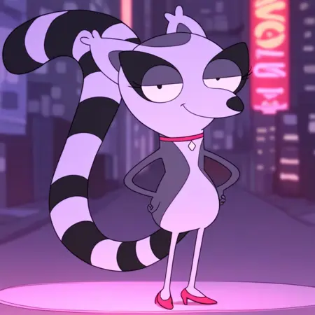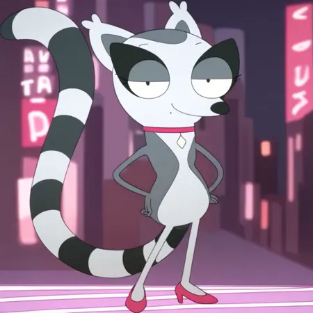ring-tailed lemur, grey and white fur, black eyes, long tail, striped tail, pink collar, red short heels,