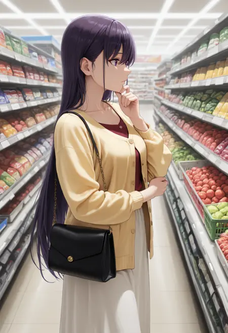 Yum1Cas, purple eyes, purple hair, long hair, straight hair, hair between eyes, hair behind ear, yellow cardigan, collarbone, red shirt, long sleeves, buttons, white skirt, long skirt