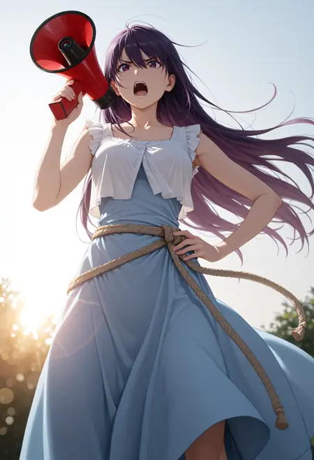 Yum1R0b3, purple eyes, purple hair, long hair, straight hair, hair between eyes, hair behind ear, collarbone, white shirt, frilled shirt, cropped shirt, dress under shirt, long dress, light blue dress, sleeveless, waist rope, rope belt