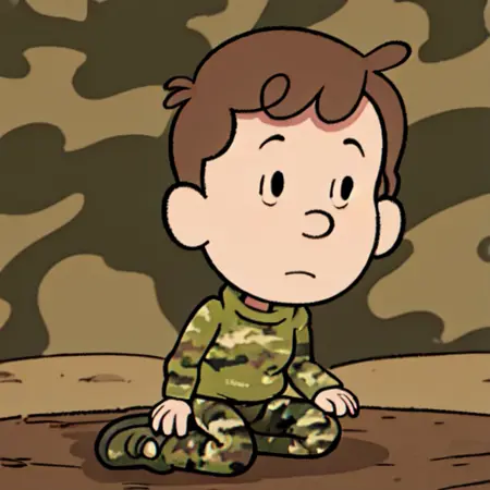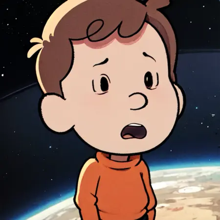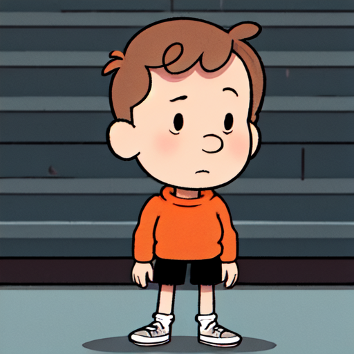 David_Hilda, 1boy, solo, short hair, brown hair, Knitted eyes, male child, sweater, orange sweater, shorts, black shorts, socks, sneakers, standing, cartoonized,