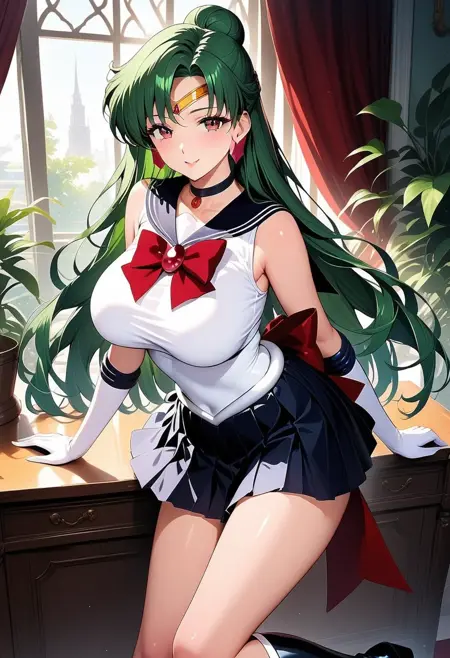 触发词:pluto_a_xl, 1girl, solo, 海王星战士,绿发,长发,单发髻,红眼,大胸,发箍,珠宝,耳环,项圈,黑色项圈,黑色水兵领,水兵战士制服,露肩,无袖,背后蝴蝶结,红色蝴蝶结,黑色裙子,白色肘部手套,黑色膝靴,
