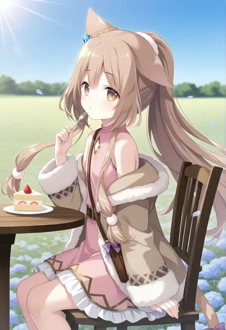 Mare Ashley-Pecker,cat ears,cat tail,tail bow,purple bow,pom pom hair ornament,gem hair ornament,braid,