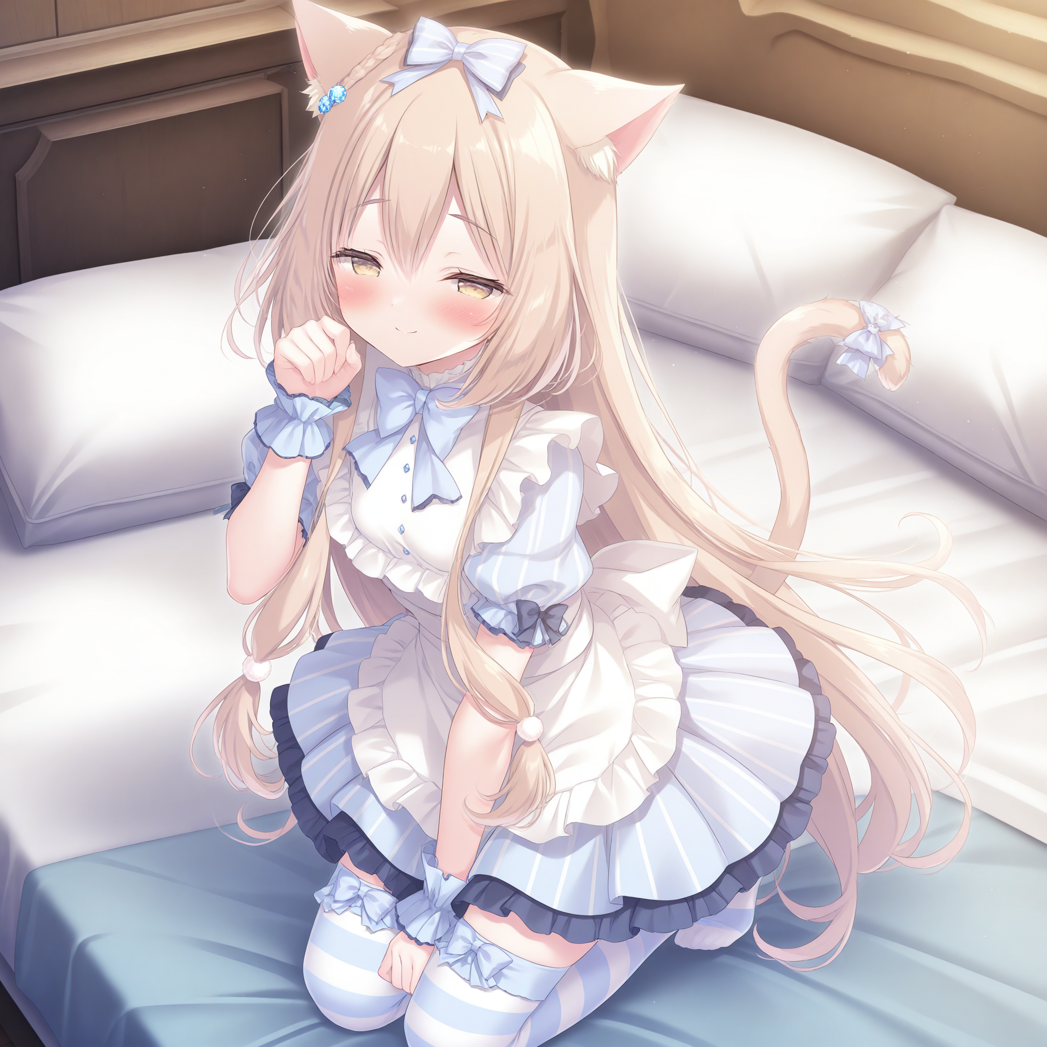 Mare Ashley Pecker,1girl,yellow eyes,small breasts,cat tail,cat ears,hair ornament,tail ornament,blonde hair,