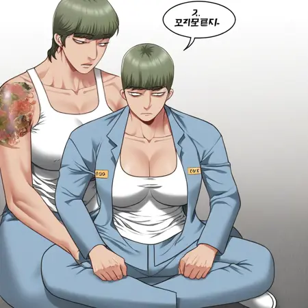| 训练词汇 | Kang Myungsun, 1girl , masculine_female, tall_female, large_breasts, saggy_breasts, pectorals, muscular, muscular_female, pectoral_cleavage, inmate_outfit, open_clothes, blue_shirt, blue_pants, large_pectorals, short_hair, green_hair, blue jacket, open_clothes, white_tank_top, arm_tattoo, shoulder_tattoo, white_sneakers已复制! |
