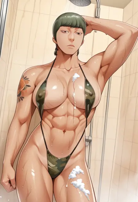 Kang Myungsun, 1girl , masculine_female, tall_female, large_breasts, saggy_breasts, pectorals, muscular, muscular_female, pectoral_cleavage, inmate_outfit, open_clothes, blue_shirt, blue_pants, large_pectorals, short_hair, green_hair, blue jacket, open_clothes, white_tank_top, arm_tattoo, shoulder_tattoo, white_sneakers