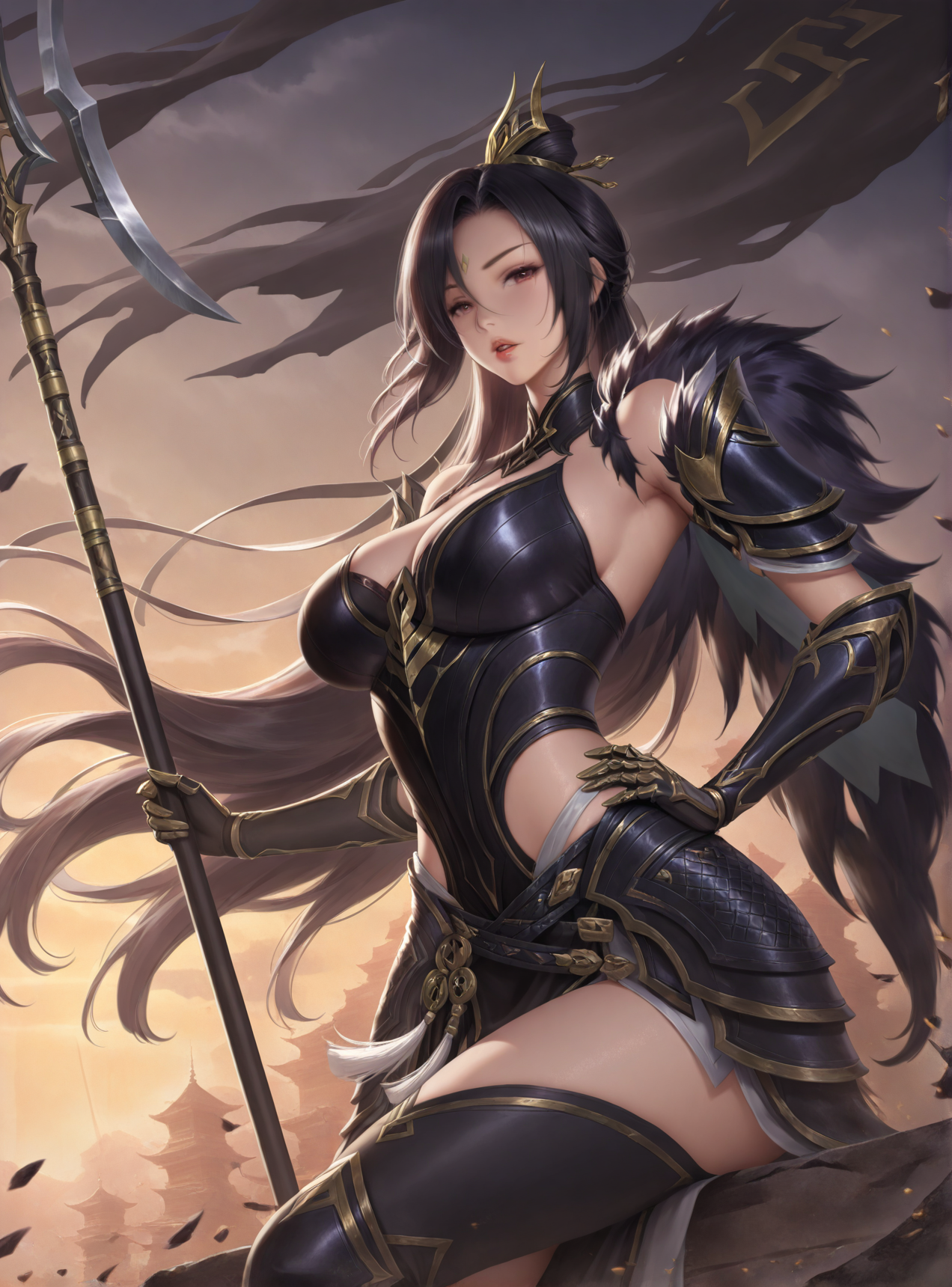 1girl,armor,black hair,breasts,hair bun,hand on own hip,holding,long hair,parted lips,polearm,solo,weapon,