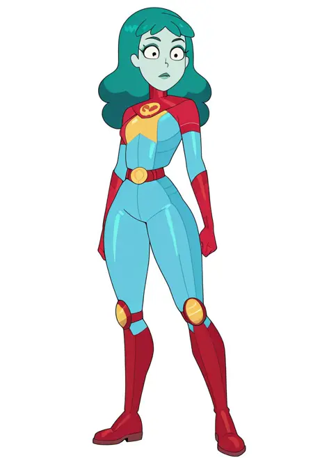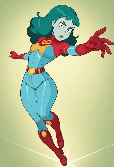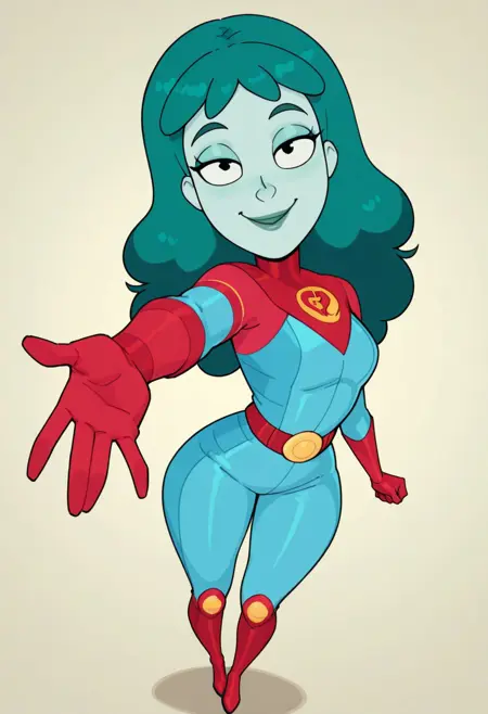 Tags: planetina, colored skin, green hair, red gloves, blue skin, long hair, belt red footwear, green lips, superhero outfit, bodysuit,, black eyes, makeup, boots,