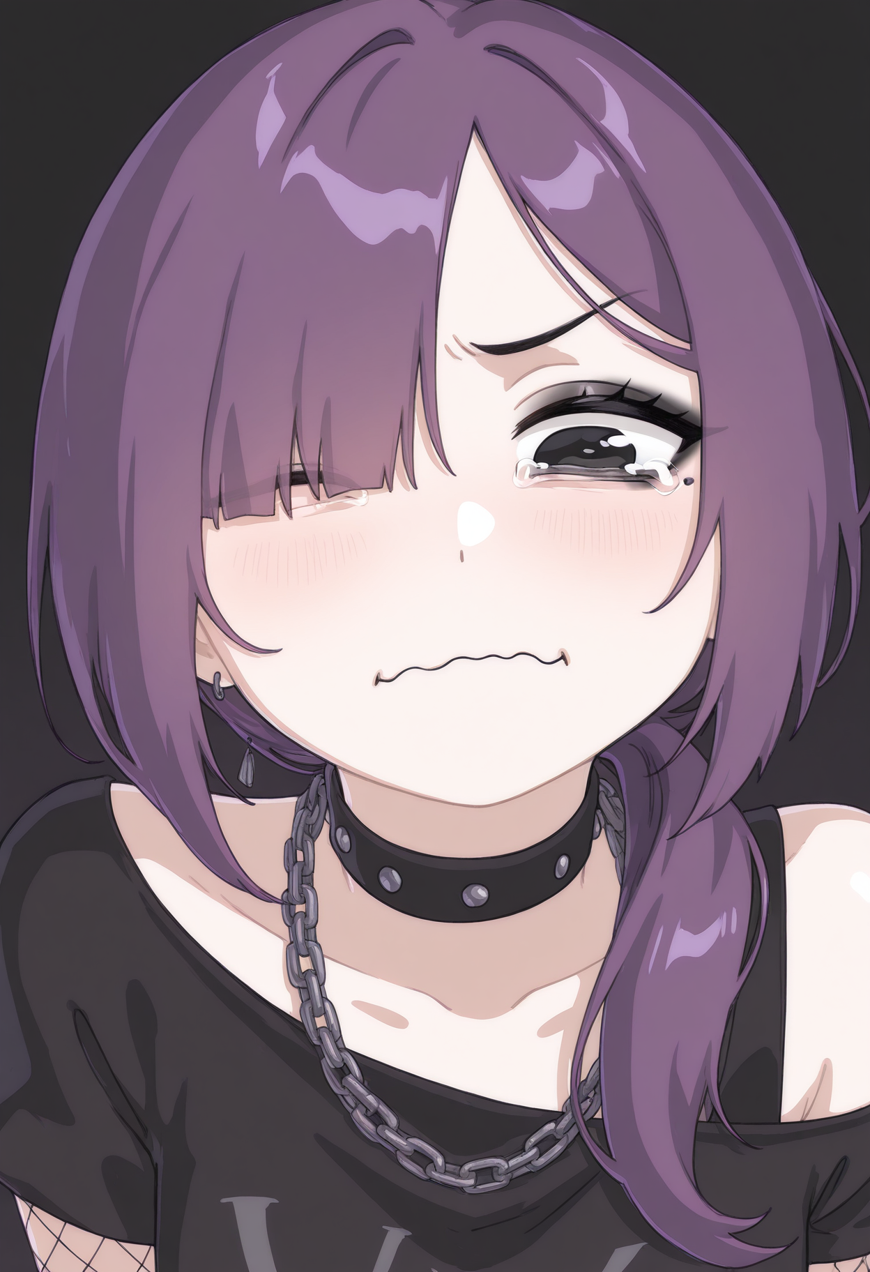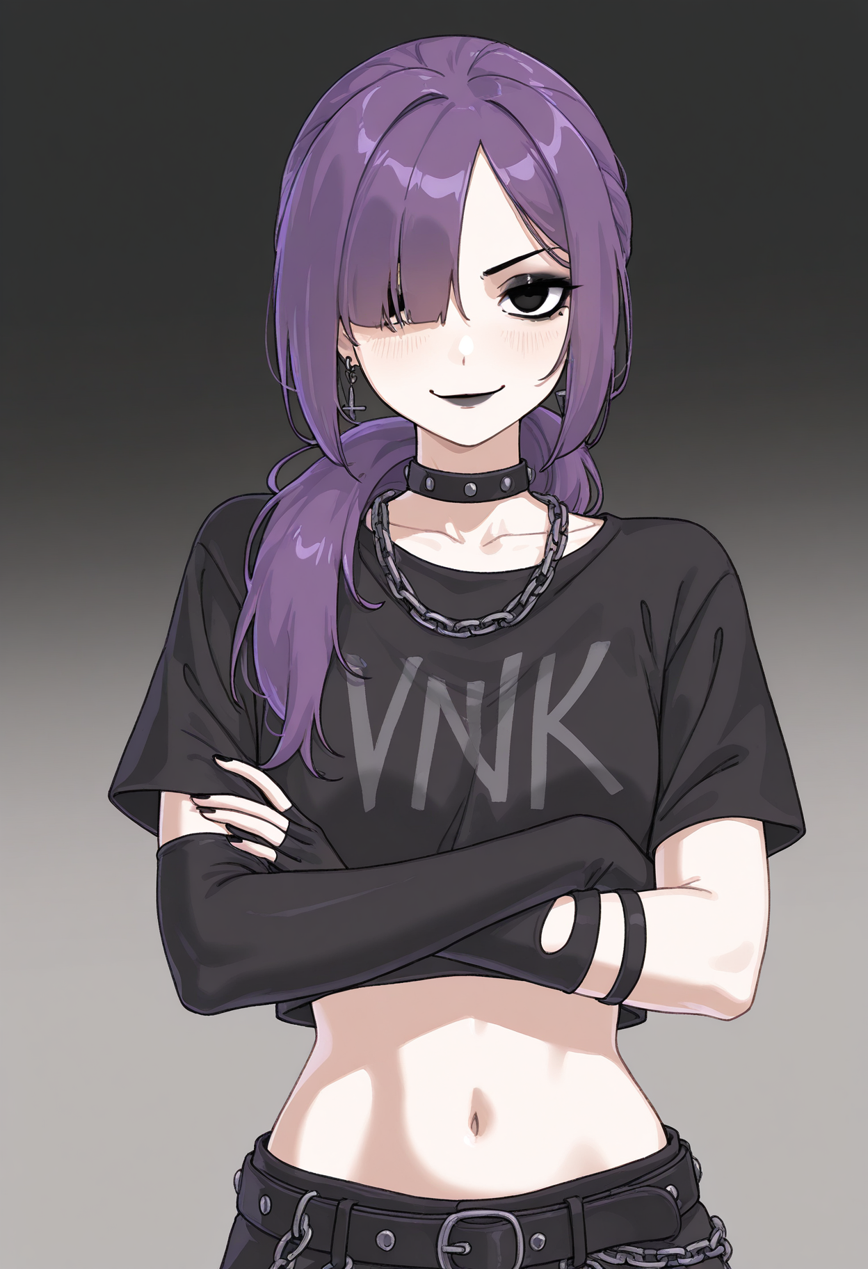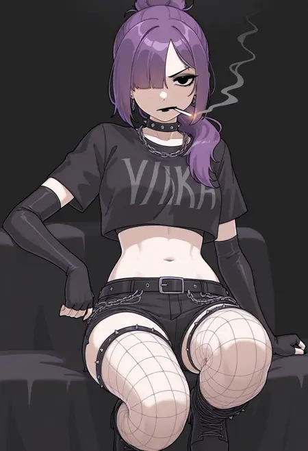 프롬프트: Yana-vkstickrs, 보라색 머리, 검은 눈, 검은 짧은 상의, 손가락없는 긴 장갑, 검은 립스틱, 초커, 체인 달린 벨트, 메이크업, 피쉬넷 스타킹, 드롭드 소매, 한쪽 눈이 머리카락에 가려짐, 고딕 또는 펑크 스타일.