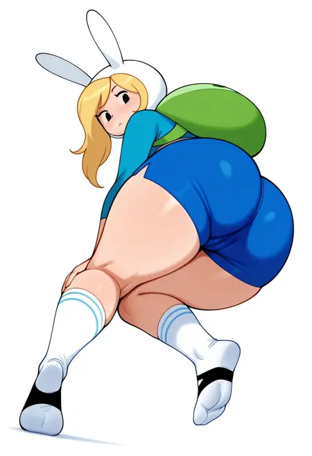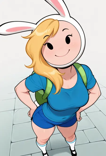 タグ: fionnathehuman, ブロンドの髪, うさぎの耳, 動物の耳, 動物のフード, うさぎのフード, 緑のパックパック, バッグ, ショートパンツ, 青いシャツ, 黒い目, 長い髪, フェイクの動物の耳, 厚い白い靴下, 太ももまで届く靴下, 黒い靴