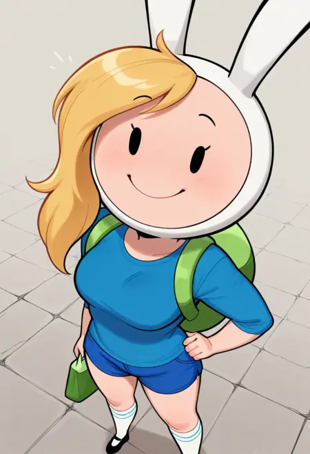 Tag: fionnathehuman, blonde hair, rabbit ears, animal ears, animal hood, animal hood, rabbit hood, green packpack, bag, shorts, blue shirt, black eyes, long hair, fake animal ears, thick white socks, thighigh socks, black footwear,
