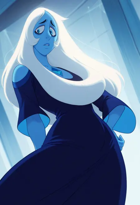タグ:bluediamond, 色付きの肌、長い髪、白い髪、青い肌、青い目、長い青いドレス、目の下のクマ、背の高い女性、まつ毛、ツヤのある唇