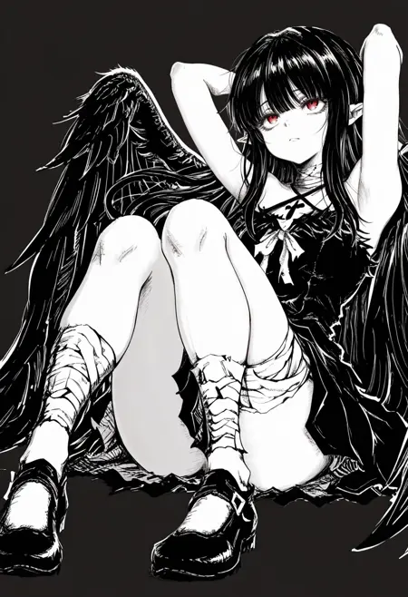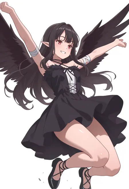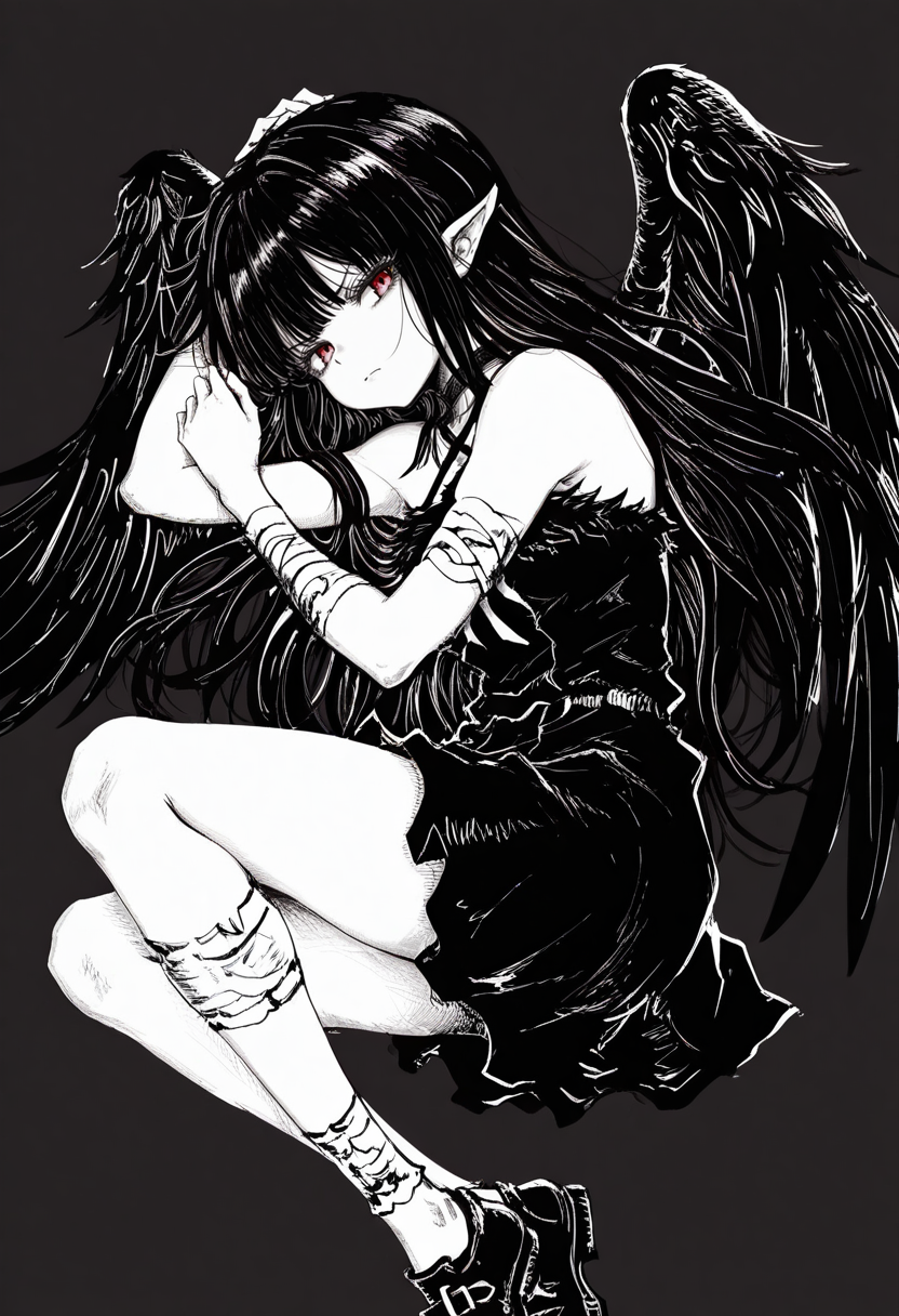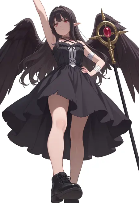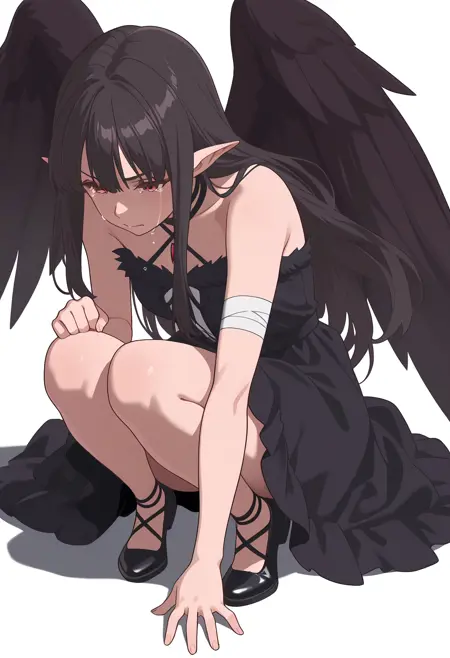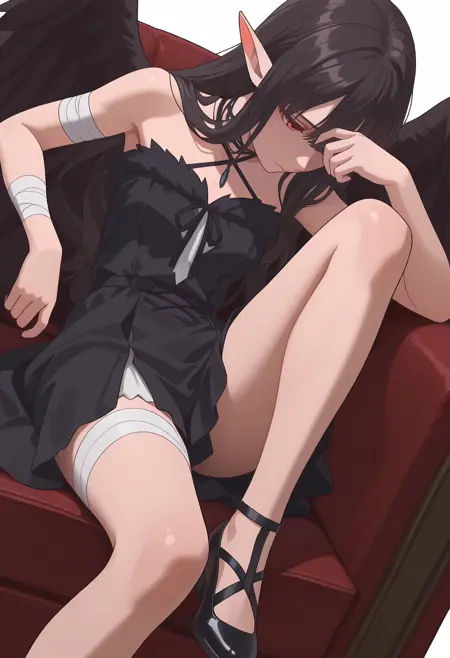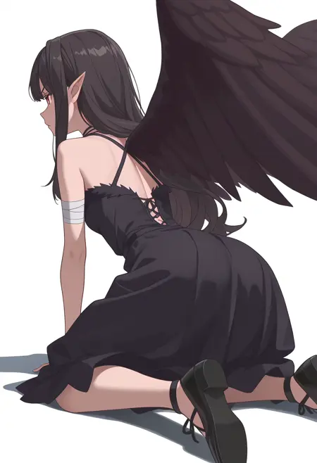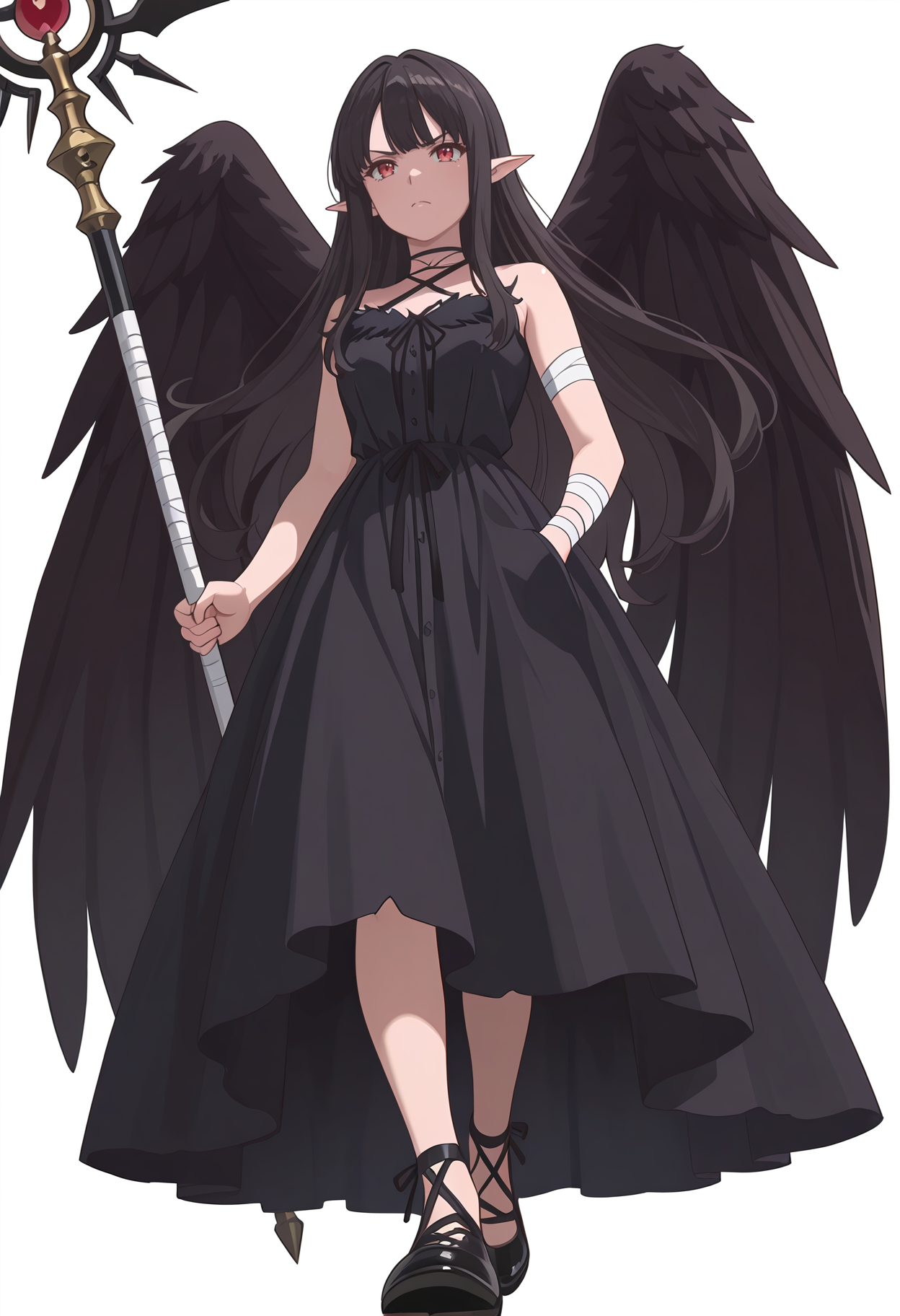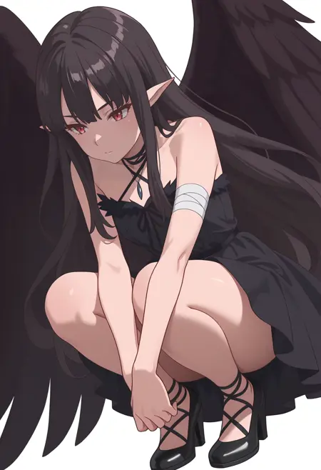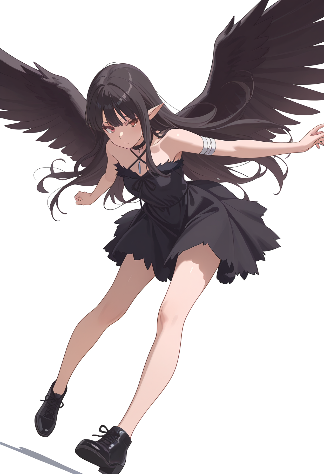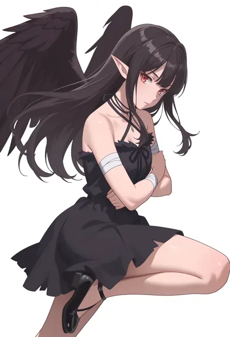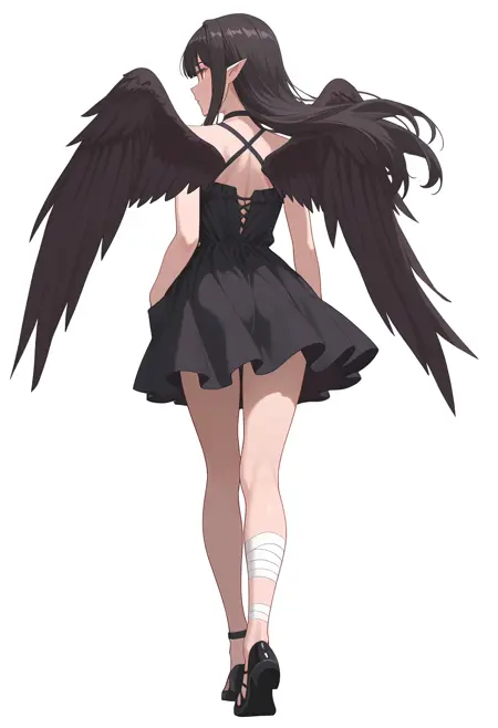 black dress, sleeveless dress, halterneck, criss-cross halter, choker, shoes, black footwear, black wings, feathered wings, bandages,