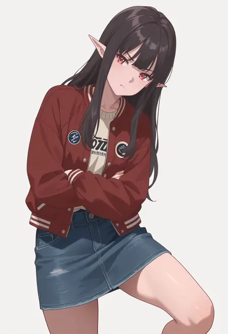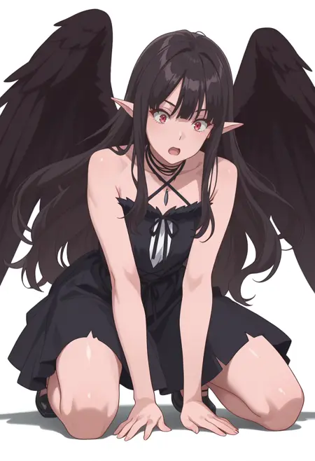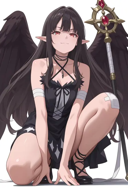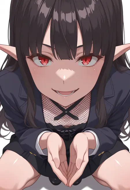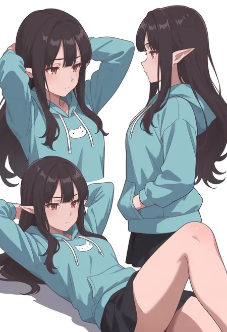 evecnn,1girl, long hair, black hair, red eyes, pointy ears, bangs,