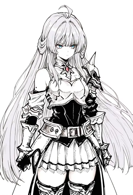 armor, skirt, thighhighs, detached sleeves, breastplate, belt, shoulder armor, gauntlets,