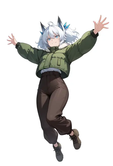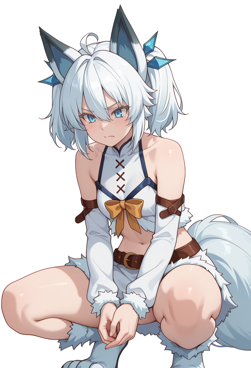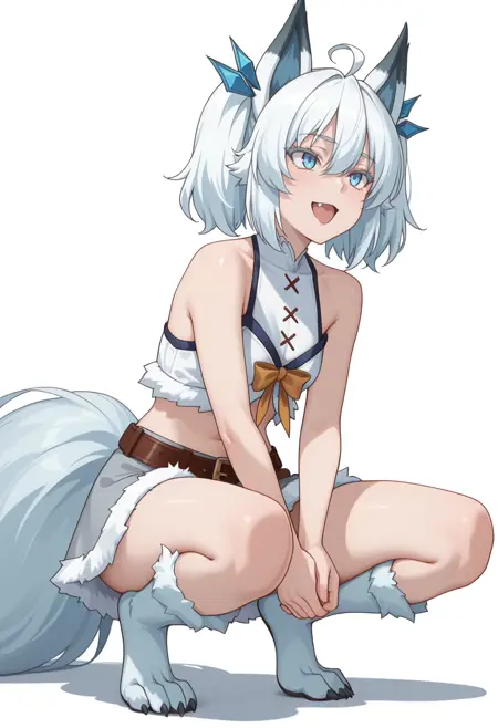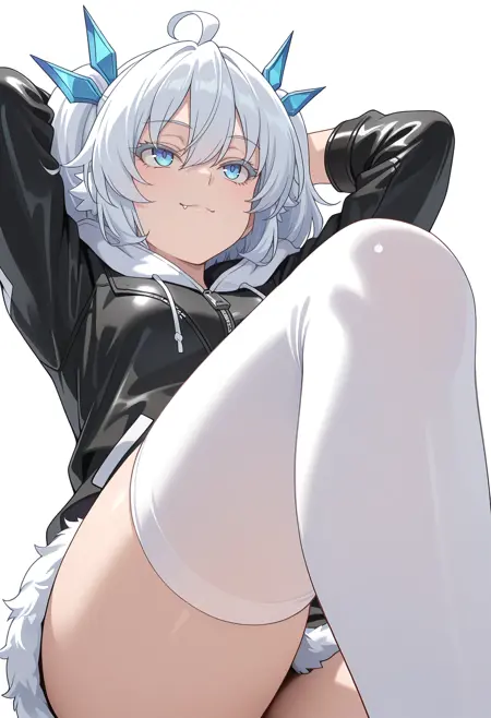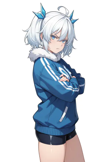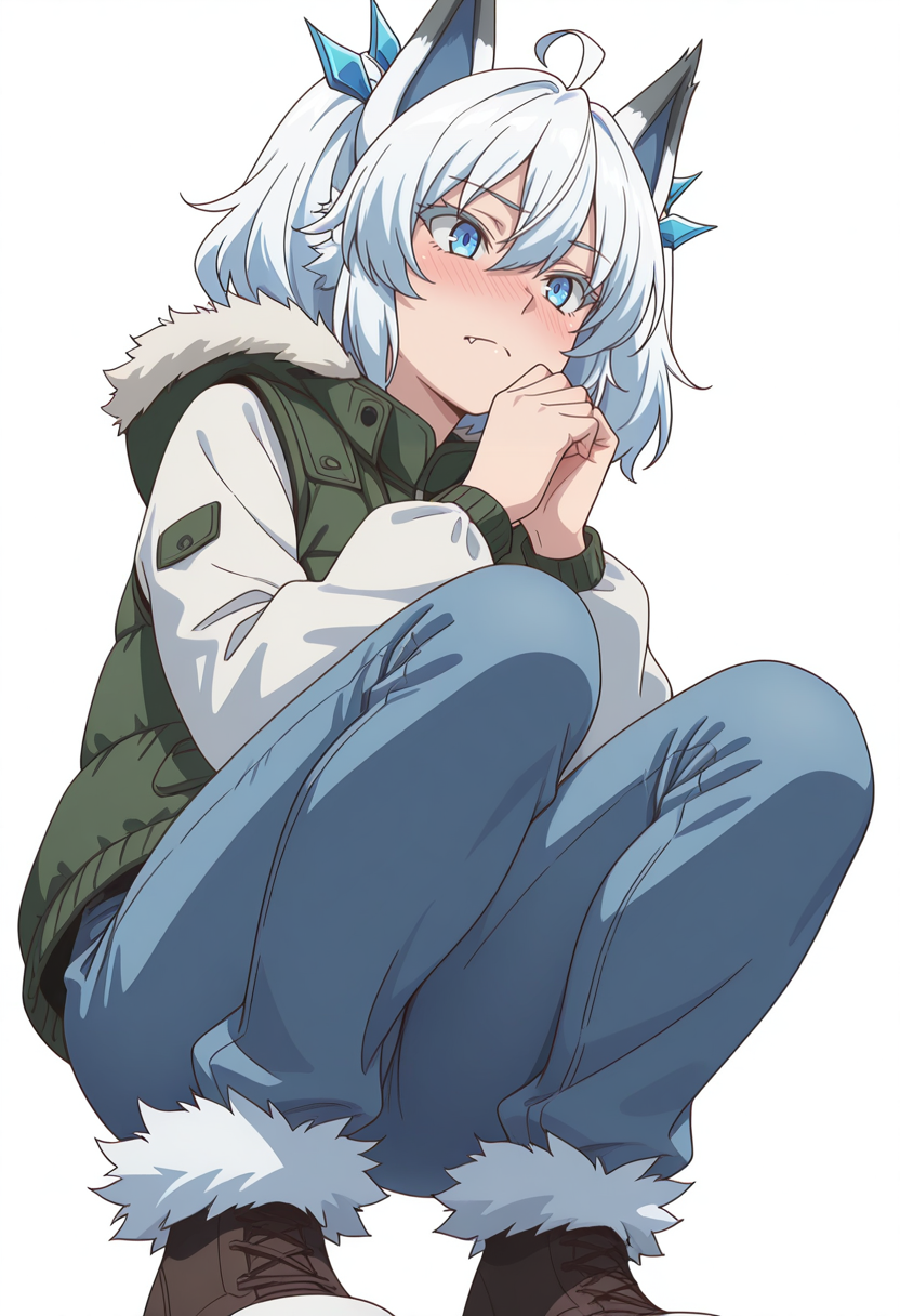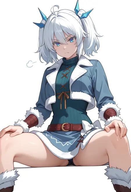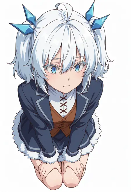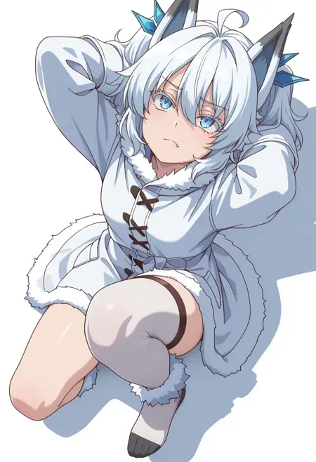 setsunacnn,1girl, short hair, hair between eyes,blue eyes, white hair, ahoge, twintails, fang,fur trim,