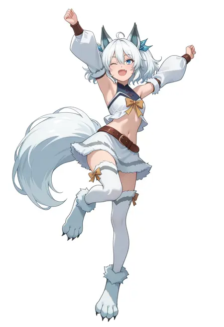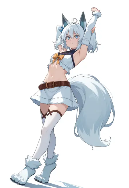 bare shoulders,belt, midriff,fox ears, fox tail,fur skirt, paw shoes, ribbon,fur thighhighs, detached sleeves,