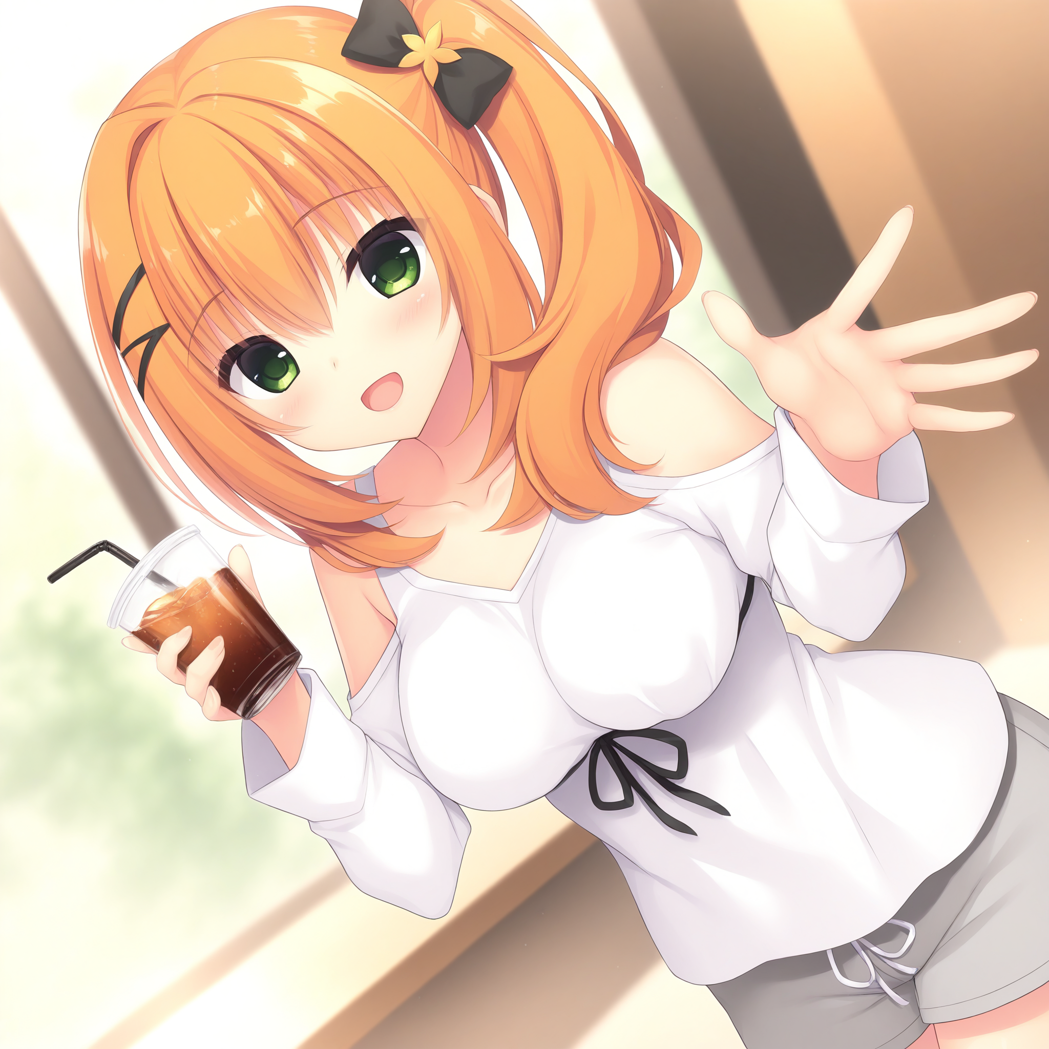 bare shoulders,long sleeves,collarbone,shoulder cutout,grey shorts,white shirt,ribbon,