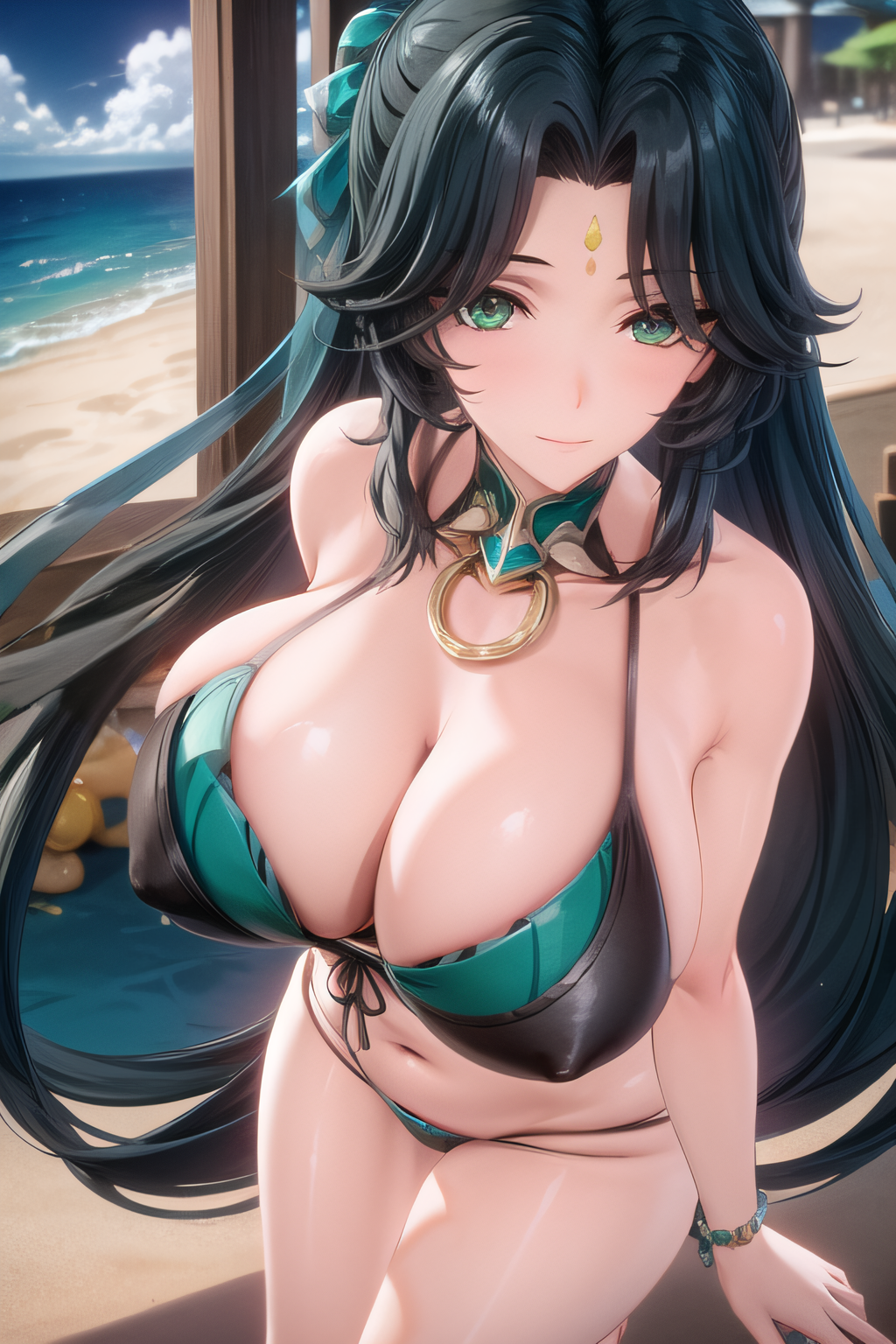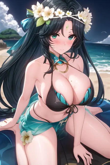 人物服装还原的关键词大致为:linghan3, head wreath, sarong, parted bangs, black bikini, front-tie top, armlet, low-tied long hair, forehead mark。