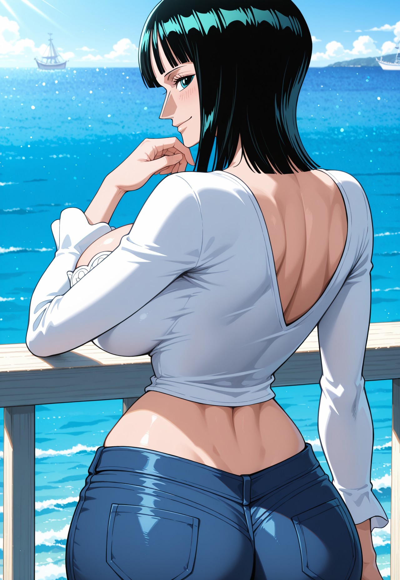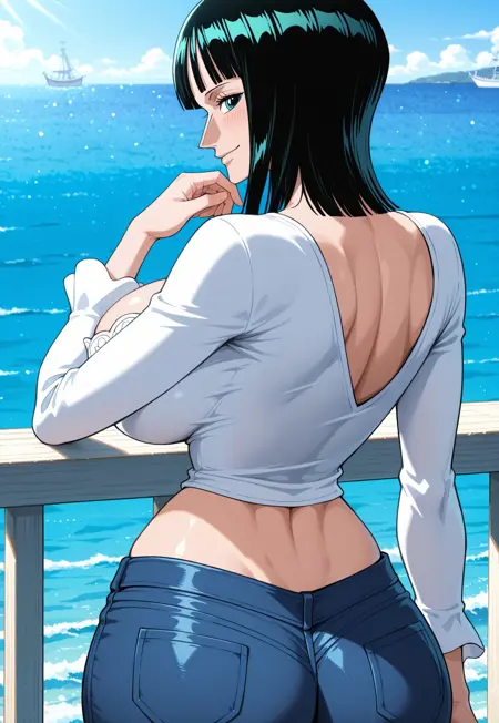 nico robin,1girl,solo,mature,long hair,bangs,blunt bangs,short hair,breasts,cleavage, medium_breasts,