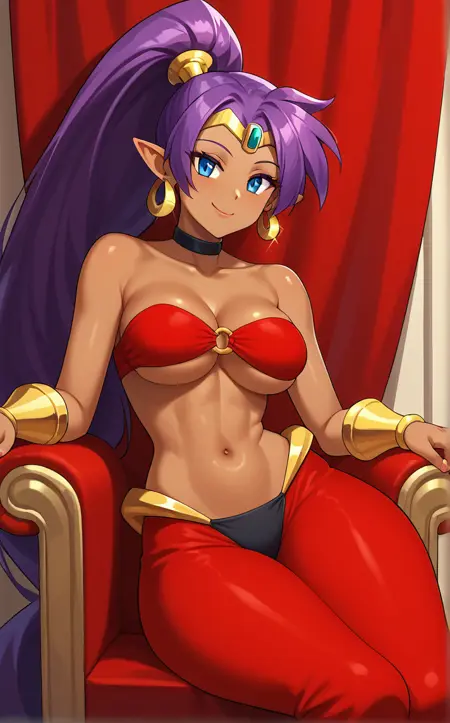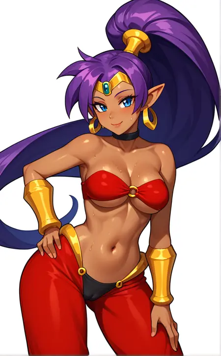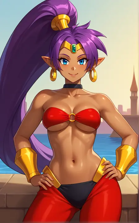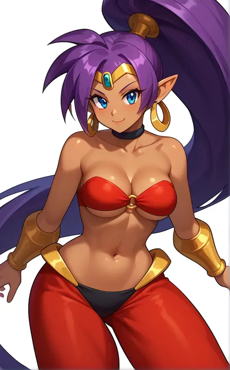 PONYXL_Shantae_ownwaifu, 1girl, blue eyes, circlet, dark skin, dark-skinned female, gold, harem pants, high ponytail, lowleg pants, bare shoulders, midriff, purple hair, red bandeau, red pants, shantae, vambraces, pointy ears, jewelry, hoop earrings, tiara, medium breasts, big hair, cleavage, bracer, navel, arabian clothes, o-ring top, collarbone, forehead jewel, black choker, long hair, underboob, lips, shiny hair, wide hips, narrow waist, bangs, colored skin, strapless, makeup, very long hair, gem,