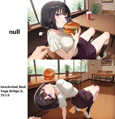 This LoRA is arched back yoga bridge pose. It is 27 images dataset of danbooru,AI distillation, and photos. The effect is good and stable because of the rich variety dataset.