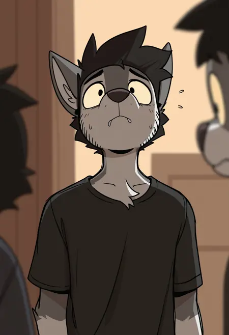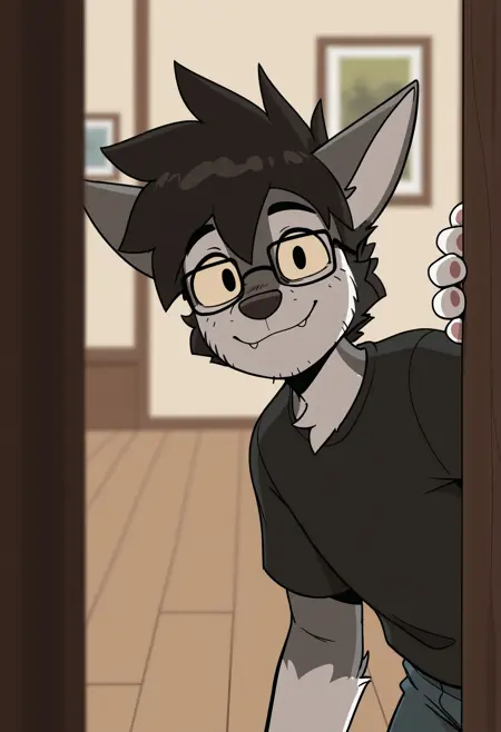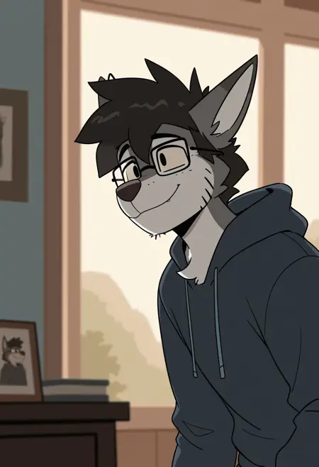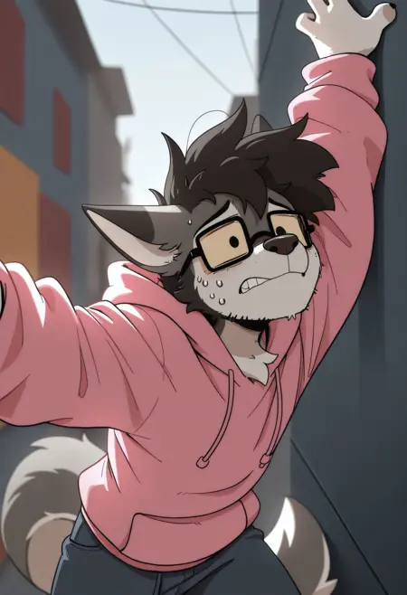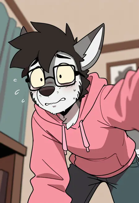 Illustrious: best quality, amazing quality, very aesthetic, absurdres, newest, zork, black_zork, 1boy, solo, furry, furry male, black hair, glasses, pink hoodie/black shirt, pants, ...your tags...