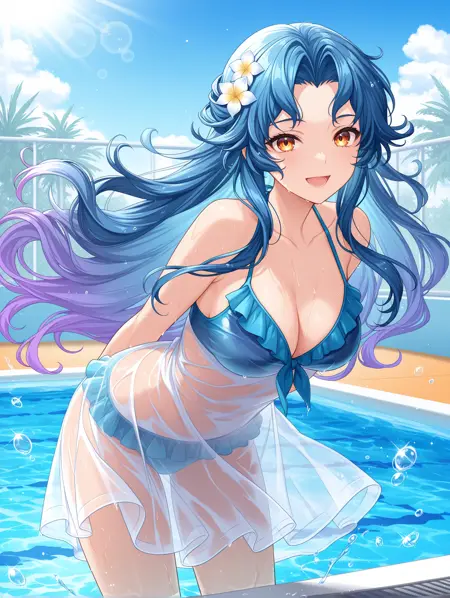 see-through dress, frilled bikini, blue bikini