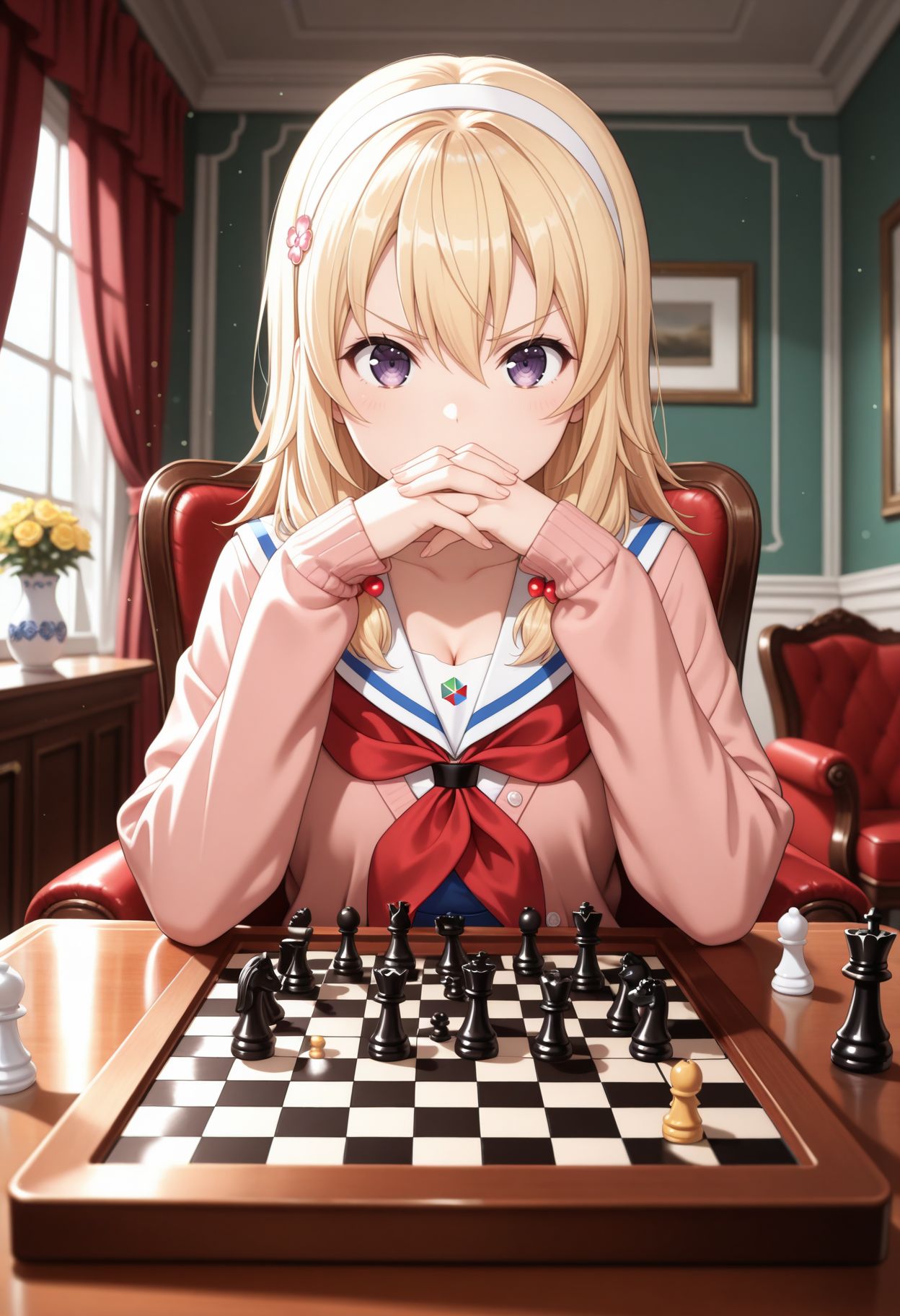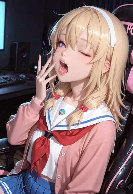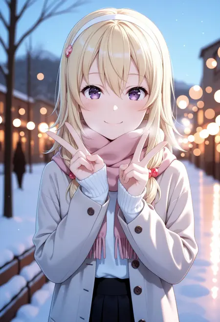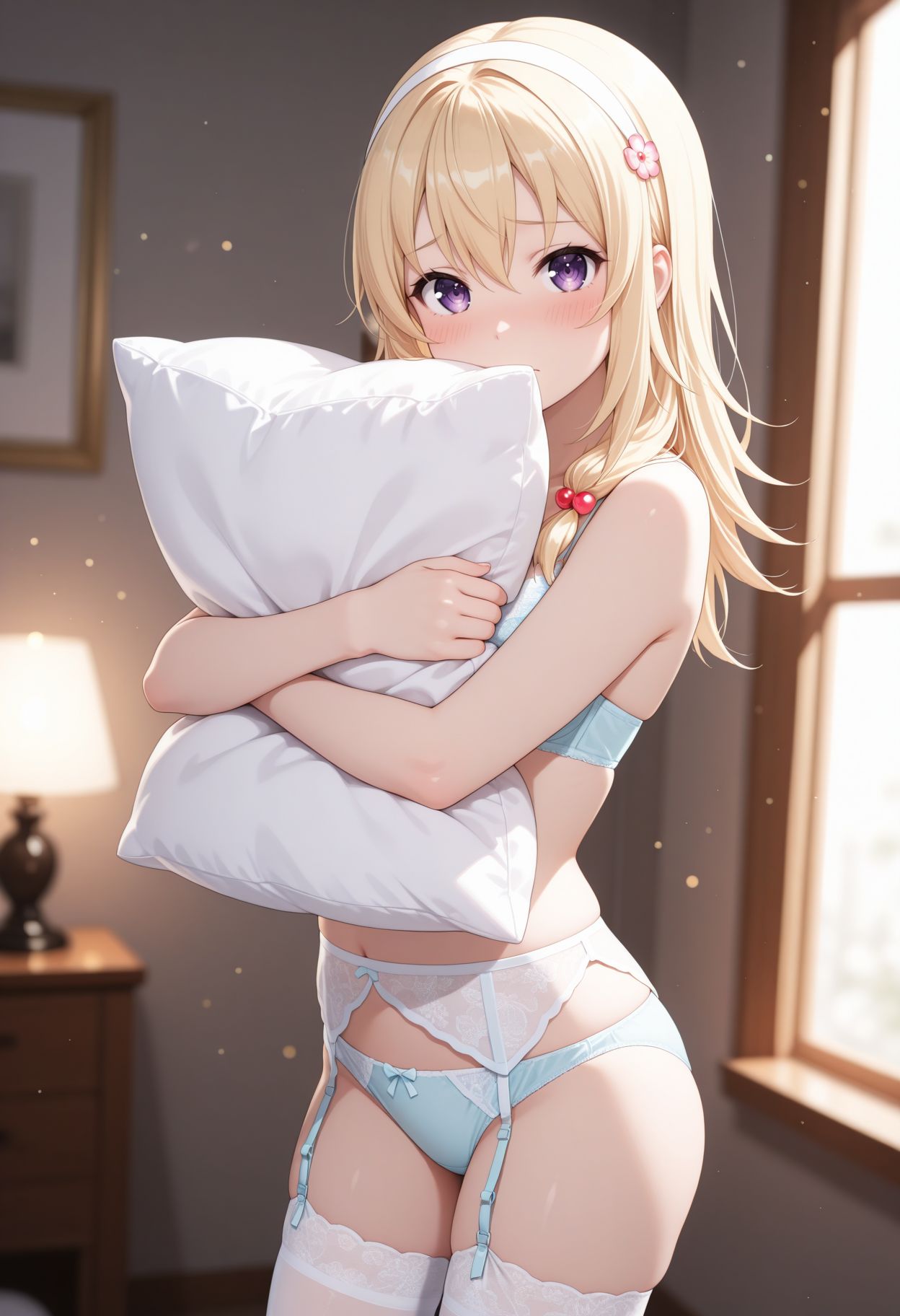 트리거: 1girl, blonde hair, purple eyes, hair ornament, hairband, long hair, hair bobbles,