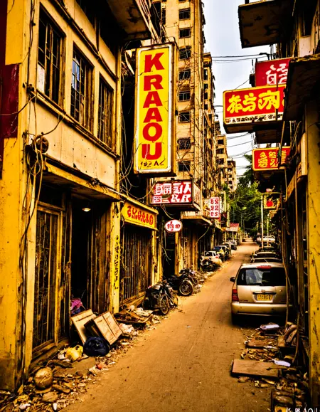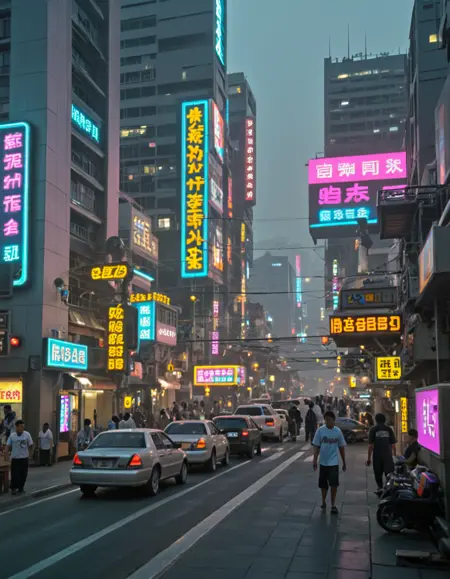 크라우 구역: 아시아식 상점과 간판이 더 많고, 인구 밀집, 교통이 붐빔. 낮은 안개.