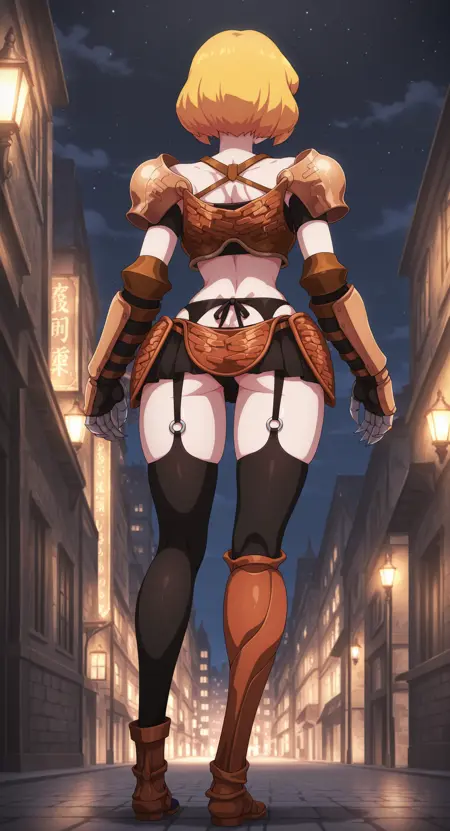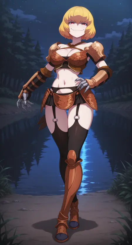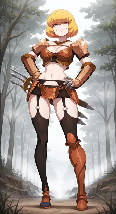 铠甲比基尼(无刀鞘):clementinegirlbikiniarmor, criss-cross_halter, shoulder_armor, pauldrons, bracer, gauntlets, claws, black_garter_belt, black_skirt, miniskirt, faulds, thighs, black_thighhighs, o-ring_legwear, armored_boots, single_knee_boot