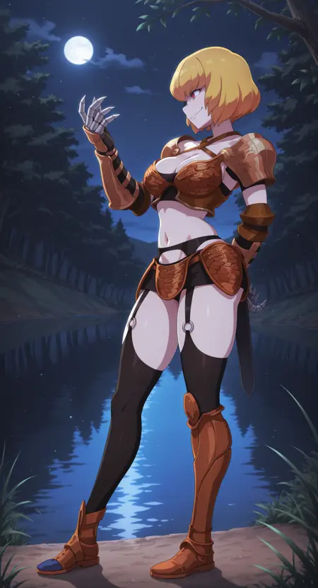 갑옷 비키니 (검집 미포함): clementinegirlbikiniarmor, criss-cross_halter, shoulder_armor, pauldrons, bracer, gauntlets, claws, black_garter_belt, black_skirt, miniskirt, faulds, thighs, black_thighhighs, o-ring_legwear, armored_boots, single_knee_boot